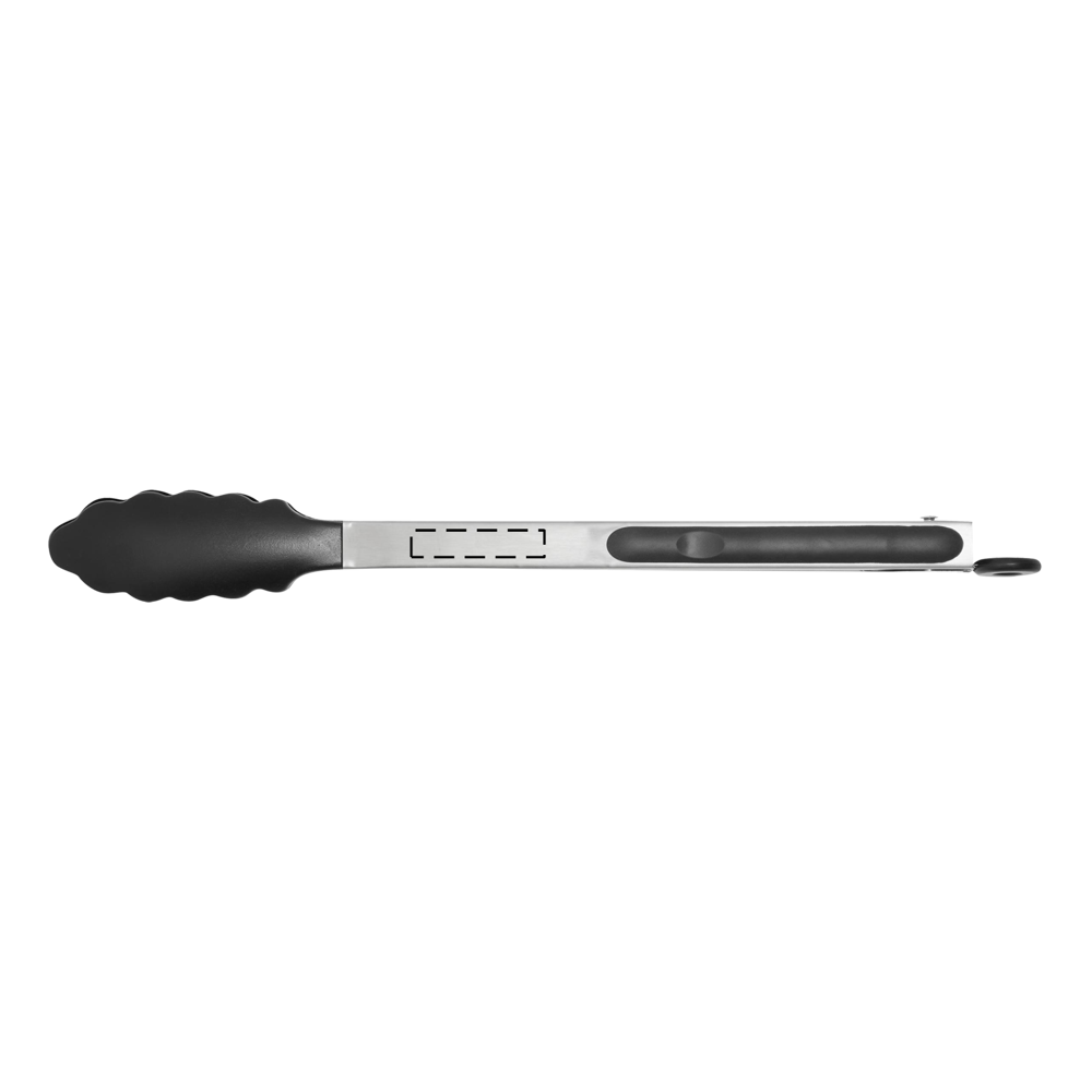 Roestvrij stalen barbecue tang GRIP met kunststof grijpers, rubberen ophanglus aan het eind en een sluiting om plaats te besparen bij het opbergen. Geschikt om mee te koken, bakken, braden en uitserveren.