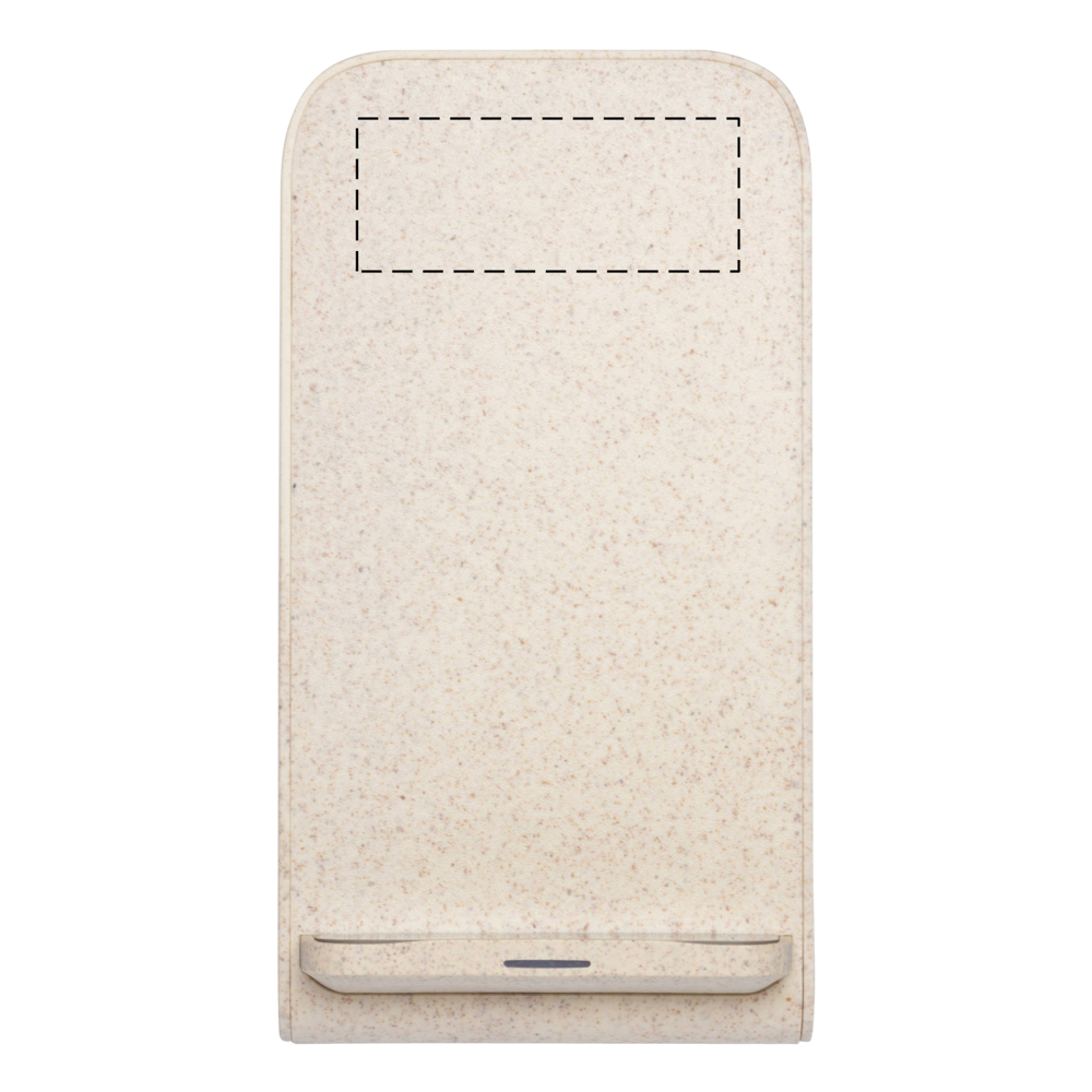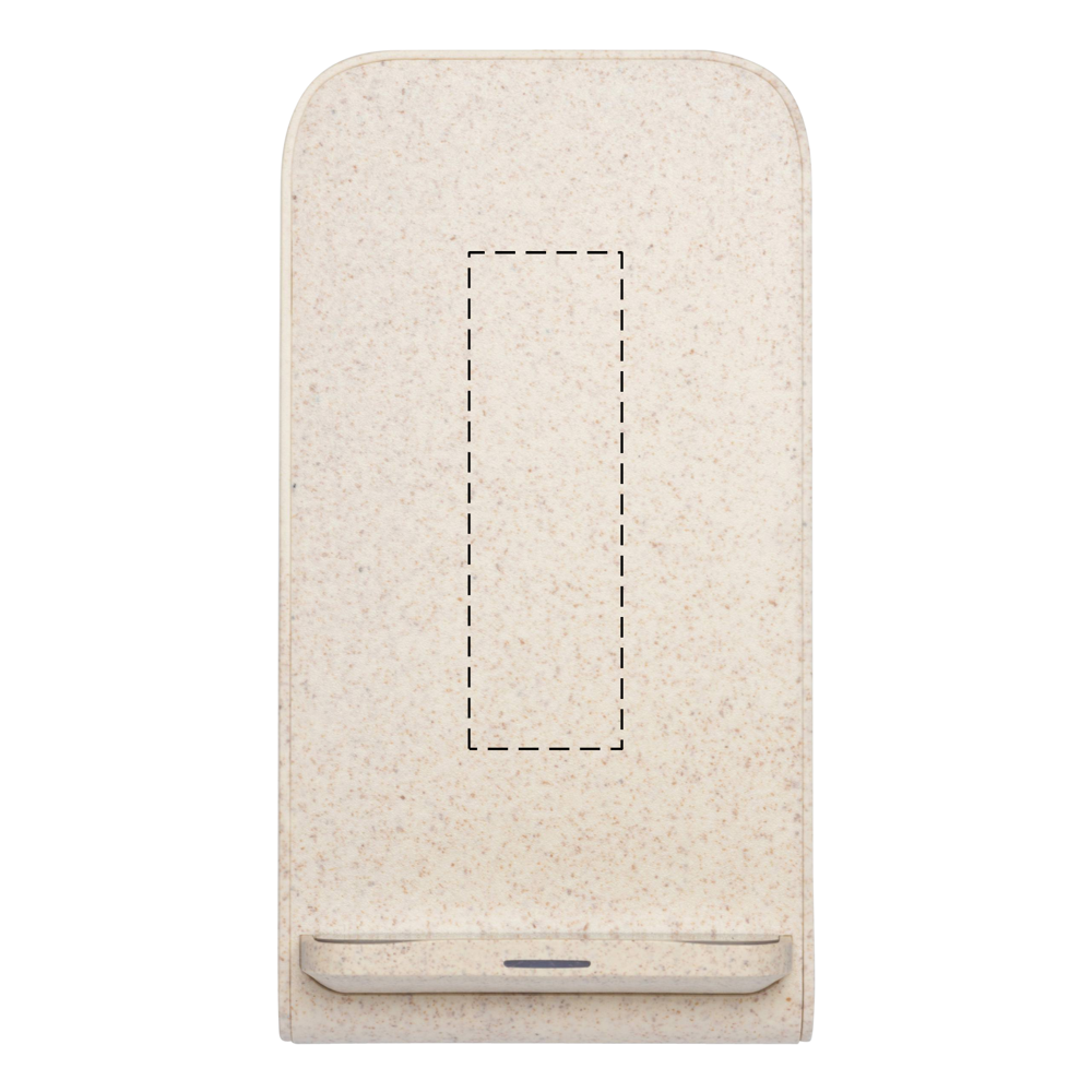 Draadloos laadstation INDUCTIVE: houder gemaakt van 35% tarwestro en 65% ABS, draadloos opladen van het apparaat door het op het contactoppervlak te plaatsen (apparaat moet zijn uitgerust voor inductief opladen), USB-kabel met USB type C-connector (lengte ca. 102 cm), het indicatielampje brandt blauw tijdens het opladen en groen wanneer het opladen is voltooid, ingangsvermogen: 5V/9V, 2 A, uitgangsvermogen: 15 W, met temperatuurregeling en detectie van vreemde voorwerpen, 4 voetjes aan de onderkant