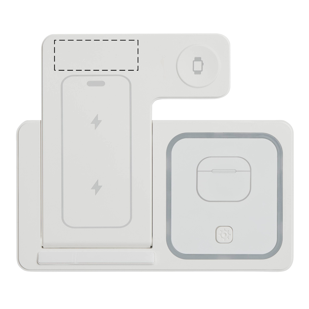 Multi-Inductief Oplaadstation MUCHA: opvouwbaar, draadloos opladen van maximaal 3 apparaten (smartphone (horizontaal of verticaal), draadloze in-ear hoofdtelefoon, Apple iWatch®) tegelijkertijd door ze op het betreffende contactoppervlak te plaatsen (apparaat moet zijn uitgerust voor inductief opladen), USB-kabel met USB type C stekker (lengte ca. 80 cm), ingangsvermogen: 9V/2A, 12V/1,67A, uitgangsvermogen: 5W, 7,5W 10W, 15W, 2,5 W (voor iWatch® en hoofdtelefoon), tijdens het opladen brandt het indicatielampje blauw, wanneer het opladen is voltooid brandt het groen, blauw knipperend wanneer vreemde voorwerpen worden gedetecteerd, aan/uit-schakelaar voor de lichtfunctie, 4 antislipvoetjes aan de onderkant, in doos.