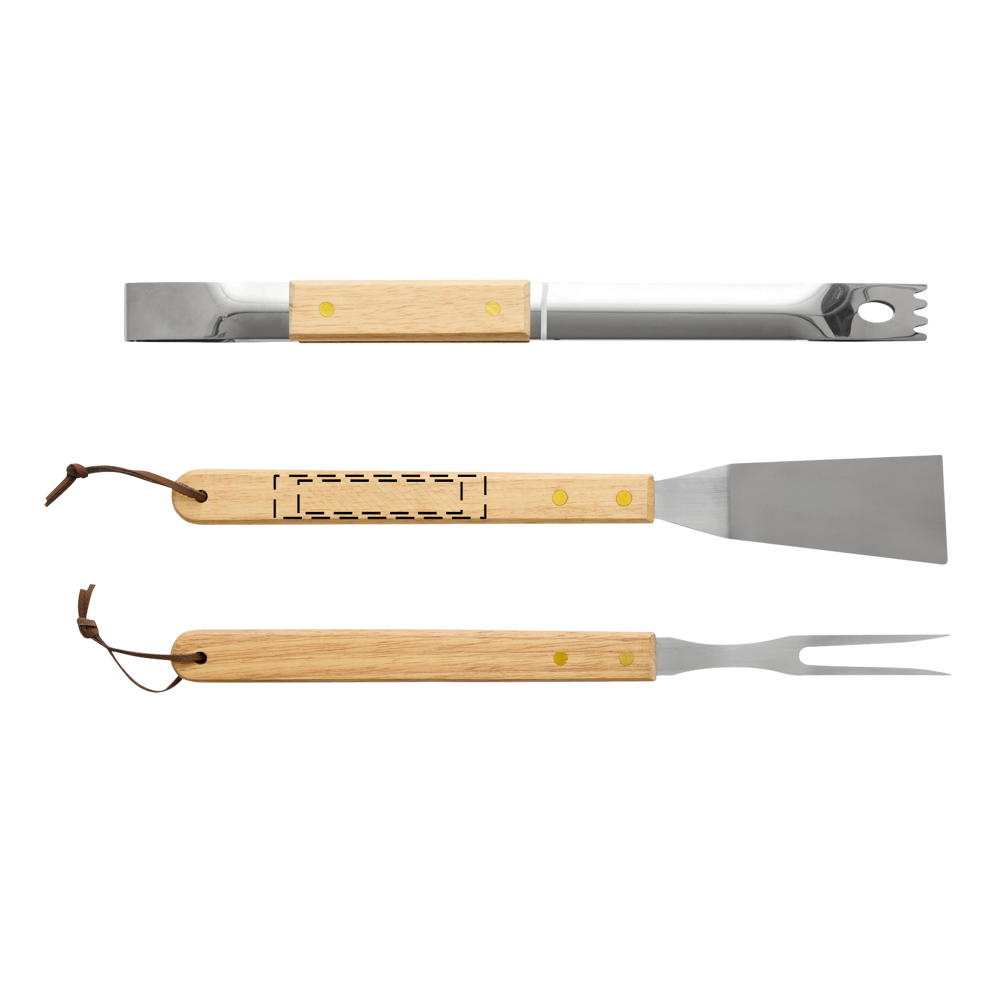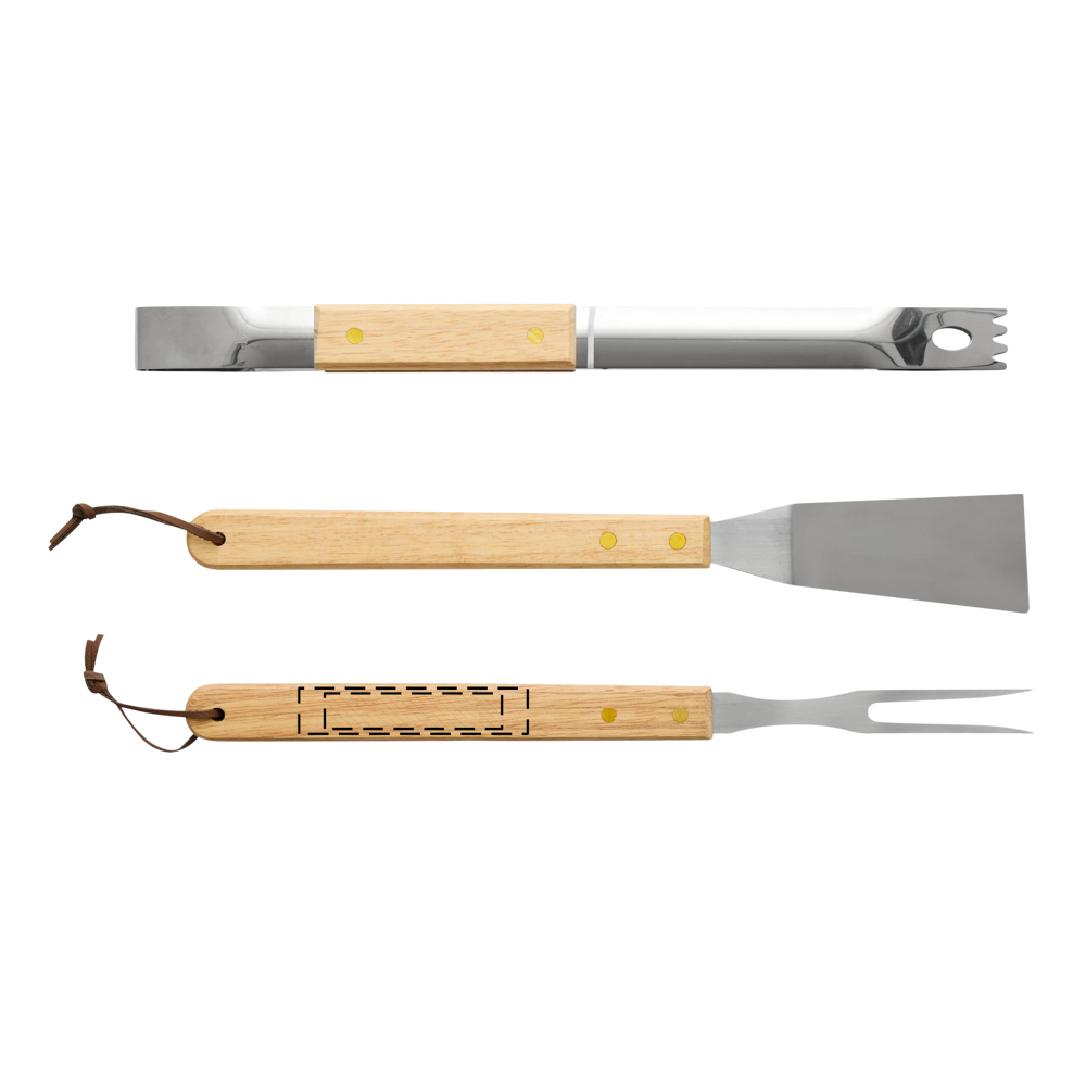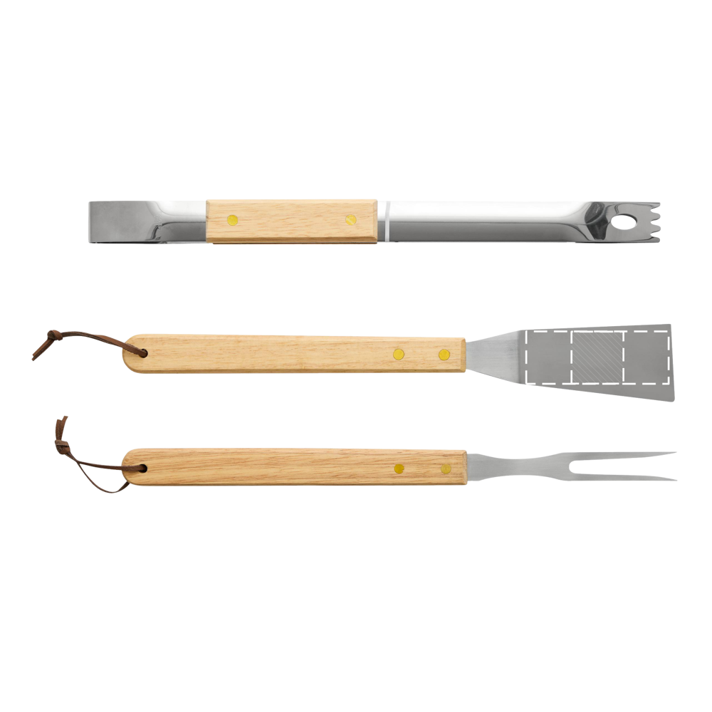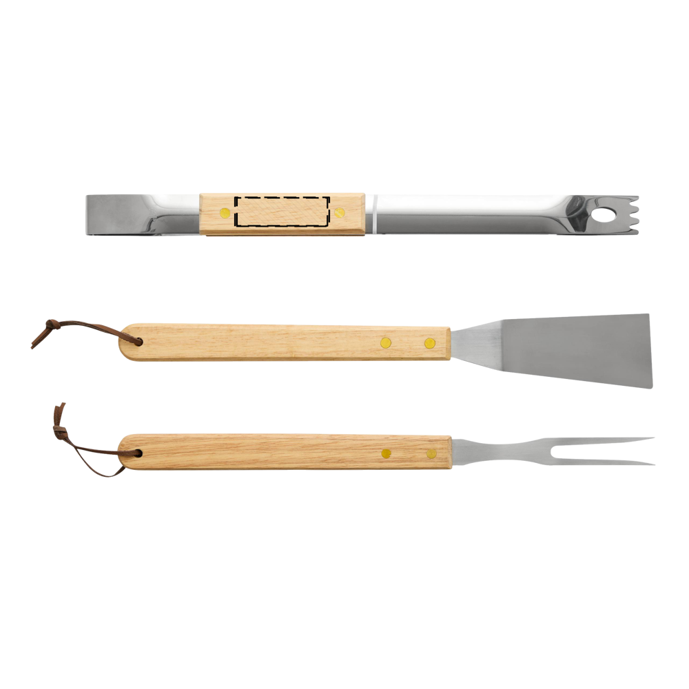 Grillbestek NATURE BBQ: braadslede, vleesvork en barbecuetang van roestvrij staal met houten handgrepen, verpakt in een doos.