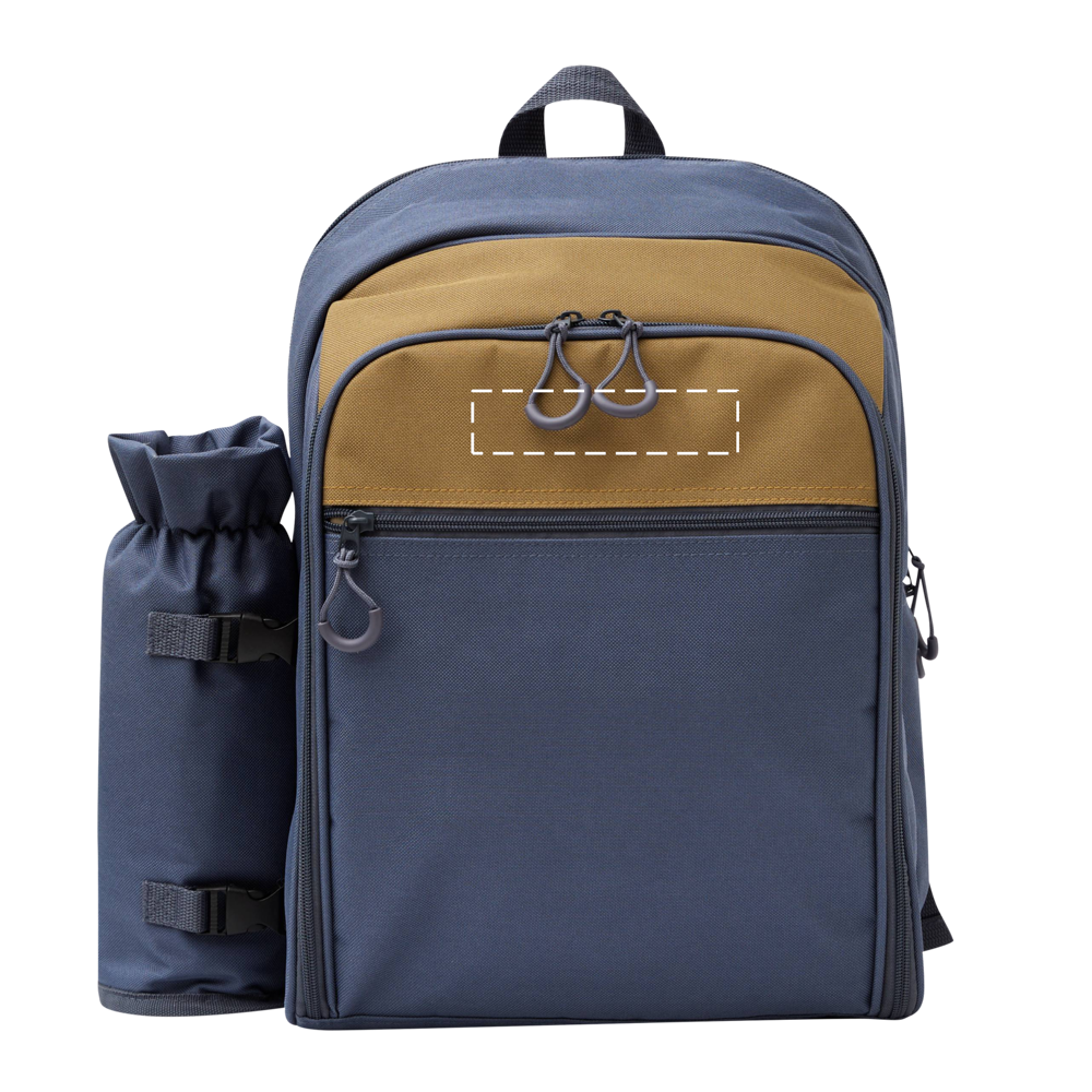 Picknick rugzak SMART TRIP voor 4 personen: geïsoleerd hoofdvak met rits, middenvak met rits incl. RVS bestek met kunststof handgrepen, 4 kunststof glazen en borden, 4 stoffen servetten, peper- en zoutstel, voorvak met rits, draaglus, gevoerde schouderriemen, 1 afneembare geïsoleerde flessenhouder aan de zijkant