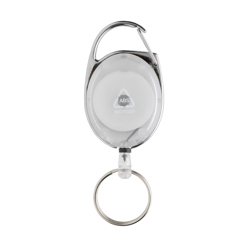 Rolclip-sleutelhanger gemaakt van RCS-gerecycled ABS en zinklegering. Ideaal item voor op kantoor, op een beurs of zelfs tijdens het skiën. Met koord van 60 cm om badge te bevestigen voor gemakkelijke toegang. Met karabijnhaak voor bevestiging aan tas of kleding. Totaal gerecycled materiaal: 34% op basis van het totale gewicht van het item. RCS-certificering zorgt voor een volledig gecertificeerde toeleveringsketen van de gerecyclede materialen. Verpakt in papieren zak.
