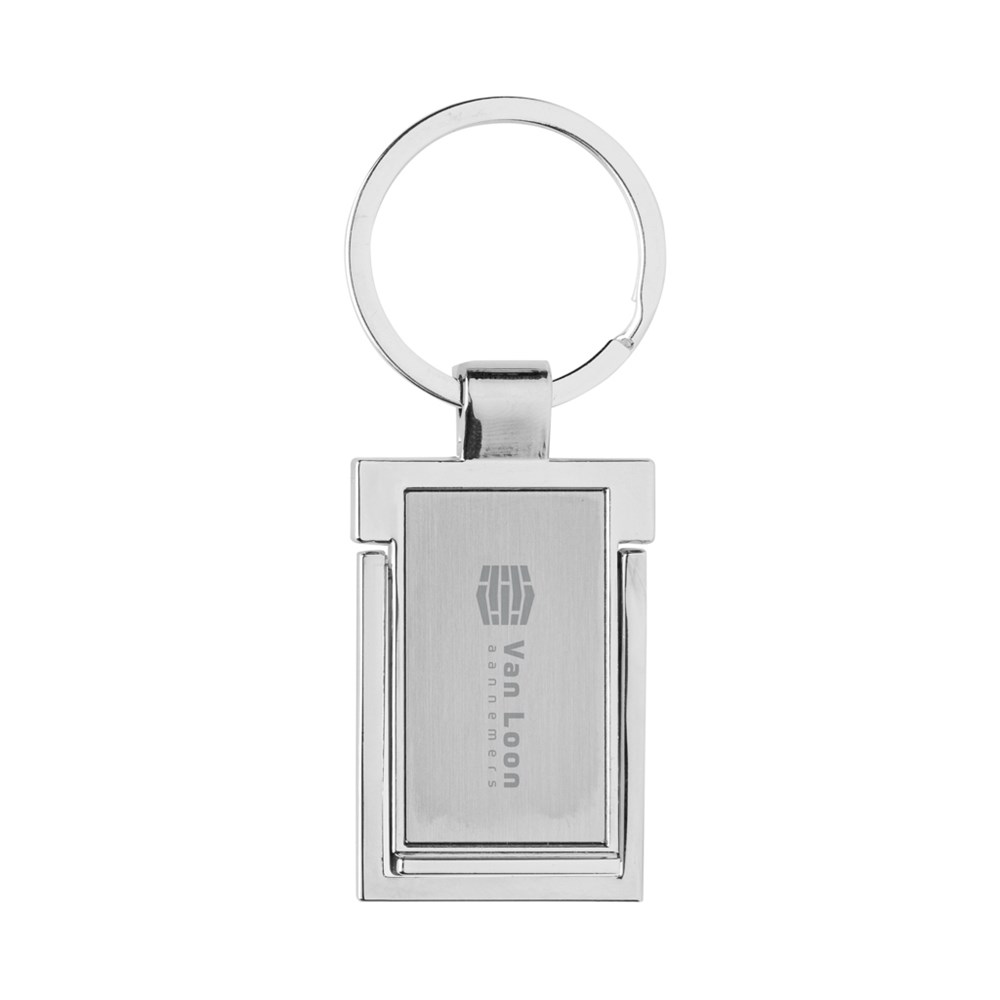 Luxe sleutelhanger met telefoonstandaard gemaakt van RCS gerecycled zinc alloy. Totaal gerecycled materiaal: 86% op basis van het totale gewicht van het item. RCS-certificering zorgt voor een volledig gecertificeerde toeleveringsketen van de gerecyclede materialen. Verpakt in papieren zak.