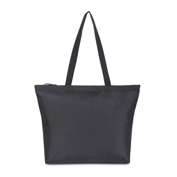 Een moderne en duurzame update van een klassieke tote bag, gemaakt van gerecycled stof en webbing van plastic flessen. Ritsopening naar het grote hoofdcompartiment. Binnenvak voor het opbergen van je drinkfles. Beschikbaar aan beide zijden van de Atlantische Oceaan. Dit item wordt in de VS en Canada ook aangeboden door Gemline.