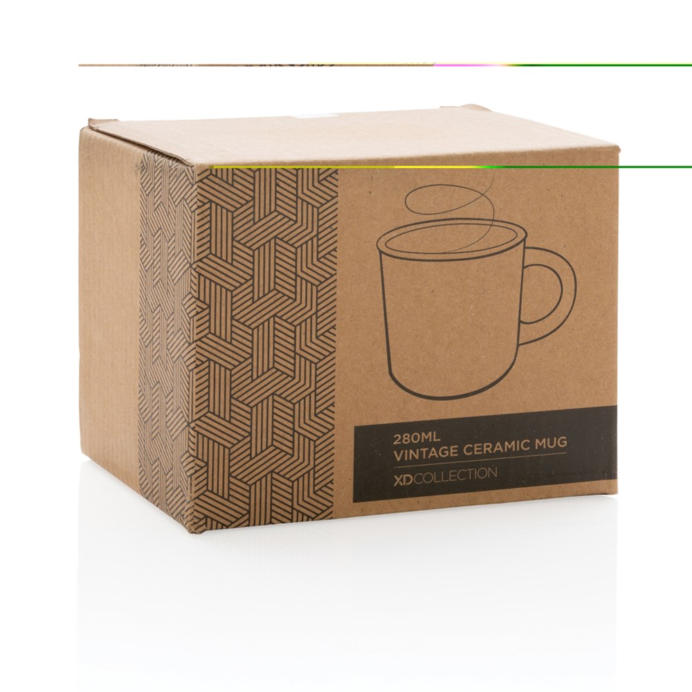 Deze mok is gemaakt van keramiek voor duurzaamheid en langdurig gebruik. De mok heeft een vintage look en is voorzien van een gebogen handvat voor een gemakkelijke grip. De mok is vaatwasmachinebestendig en is getest in overeenstemming met EN12875-1 (minimaal 125 wasbeurten) voor alle decoratiemethoden. Verpakt in een geschenkdoos. Capaciteit 280 ml.