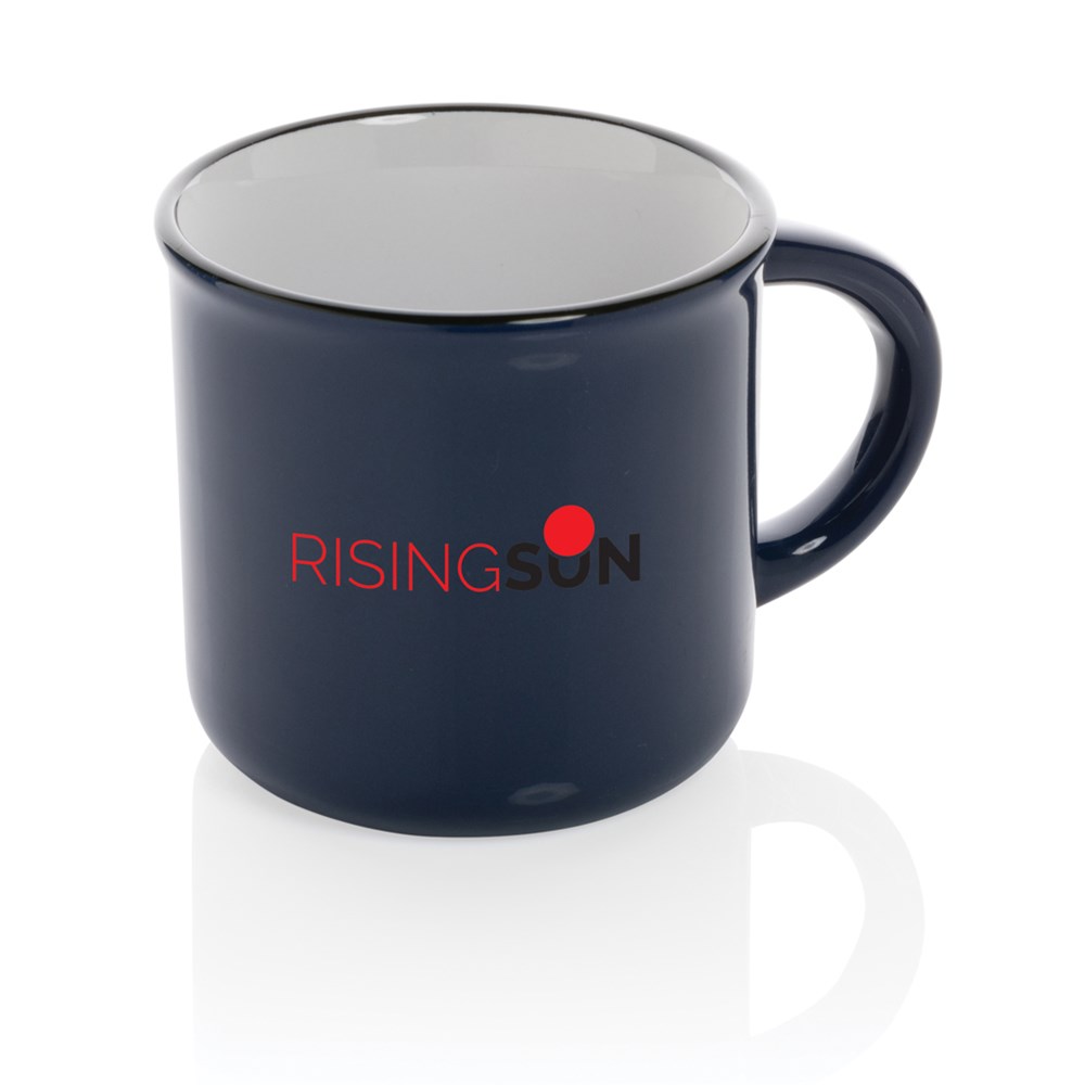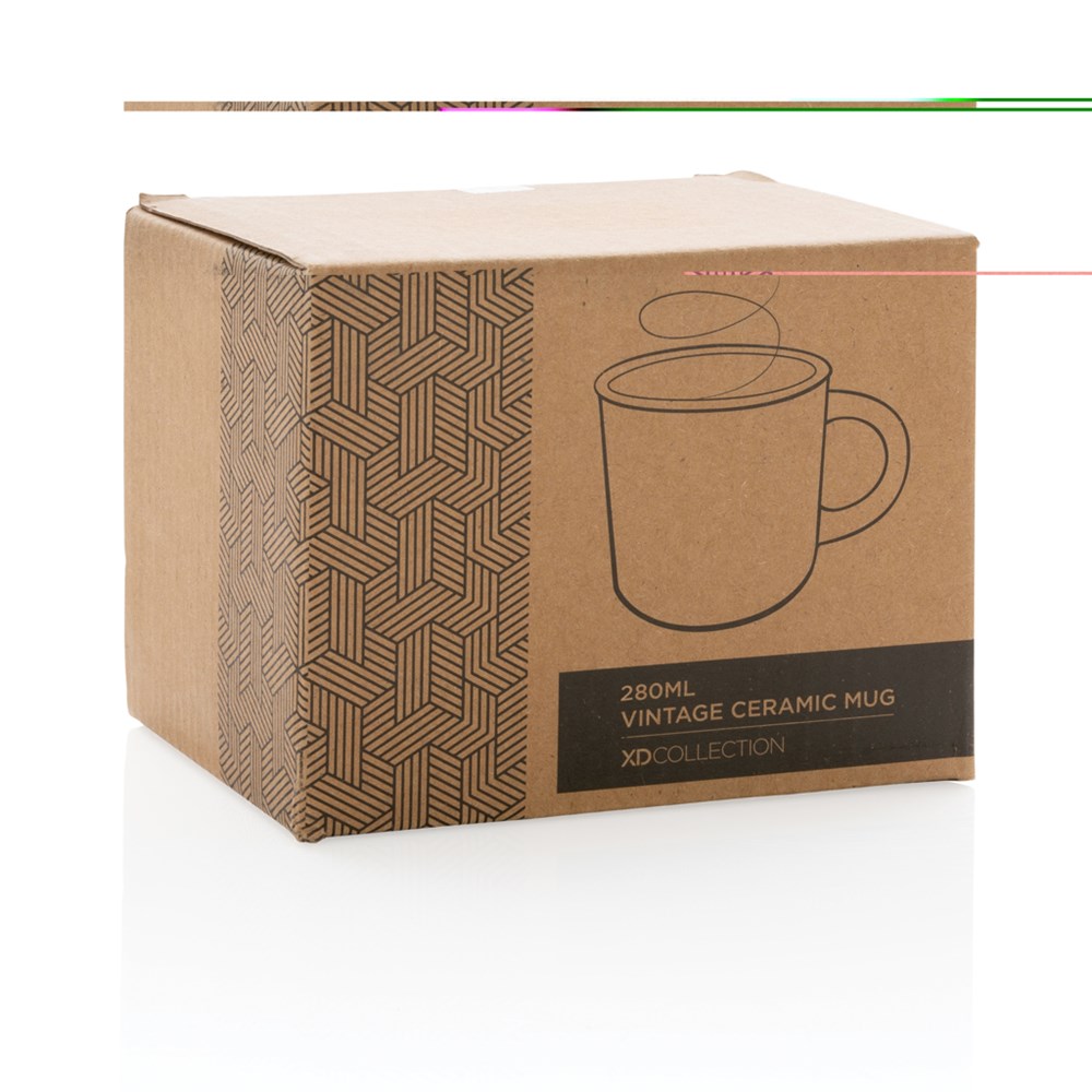 Deze mok is gemaakt van keramiek voor duurzaamheid en langdurig gebruik. De mok heeft een vintage look en is voorzien van een gebogen handvat voor een gemakkelijke grip. De mok is vaatwasmachinebestendig en is getest in overeenstemming met EN12875-1 (minimaal 125 wasbeurten) voor alle decoratiemethoden. Verpakt in een geschenkdoos. Capaciteit 280 ml.