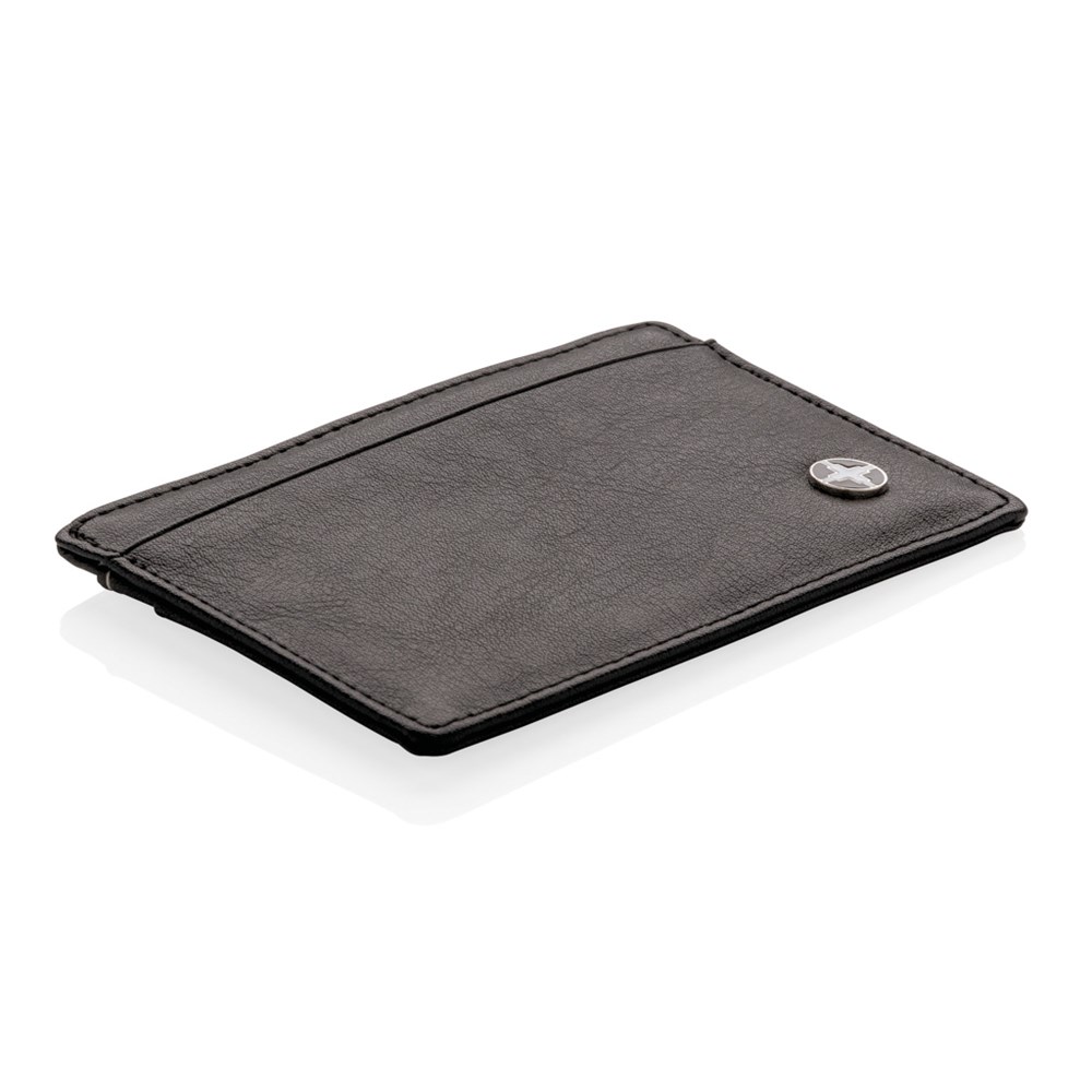 Premium PU lederen kaarthouder met 3 afgeschermde anti-skimming card slots met ruimte voor 8 kaarten. Aparte midden pocket voor contant geld en munten.