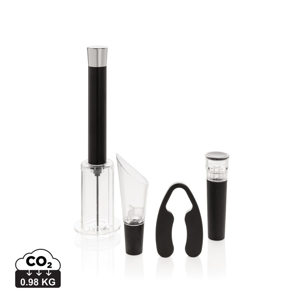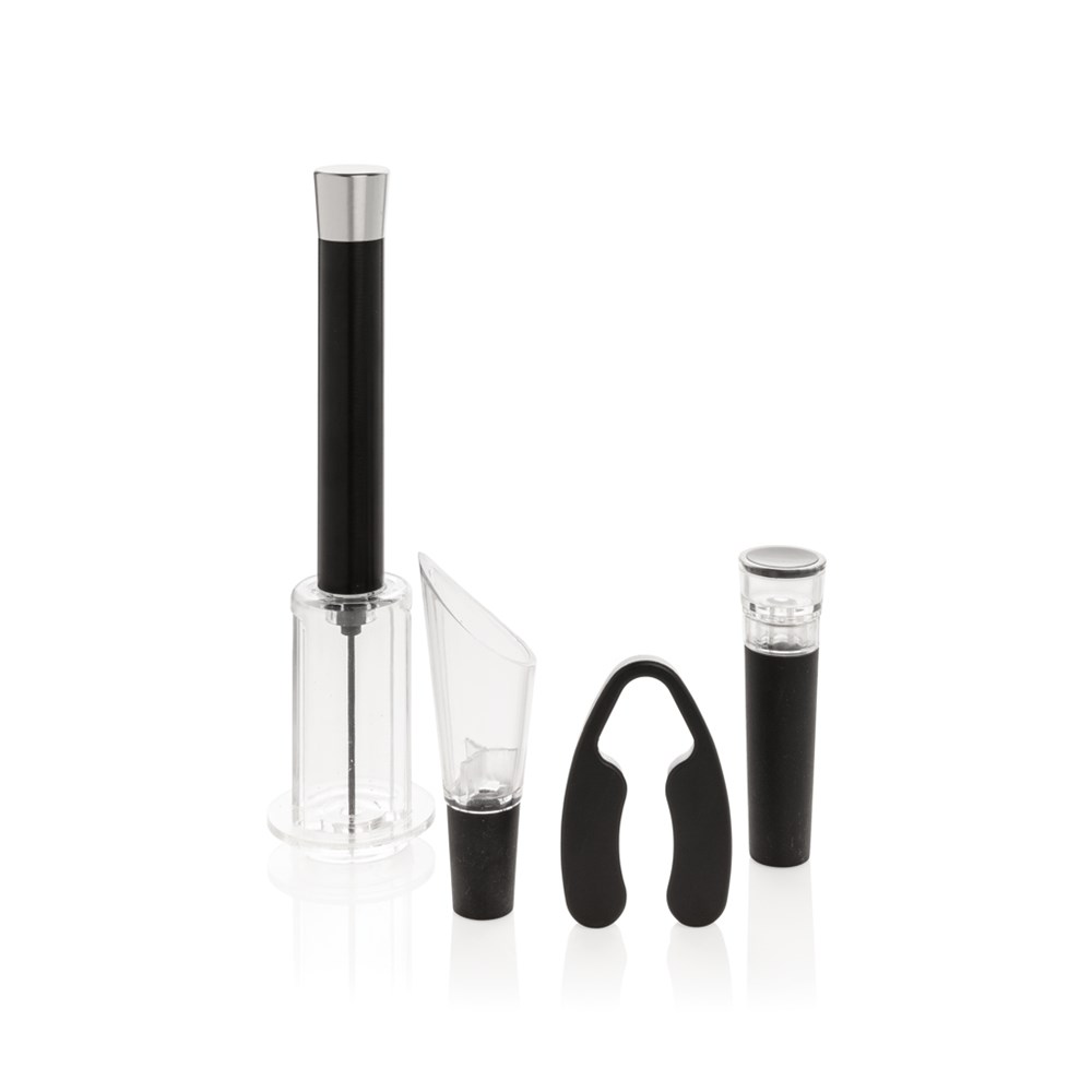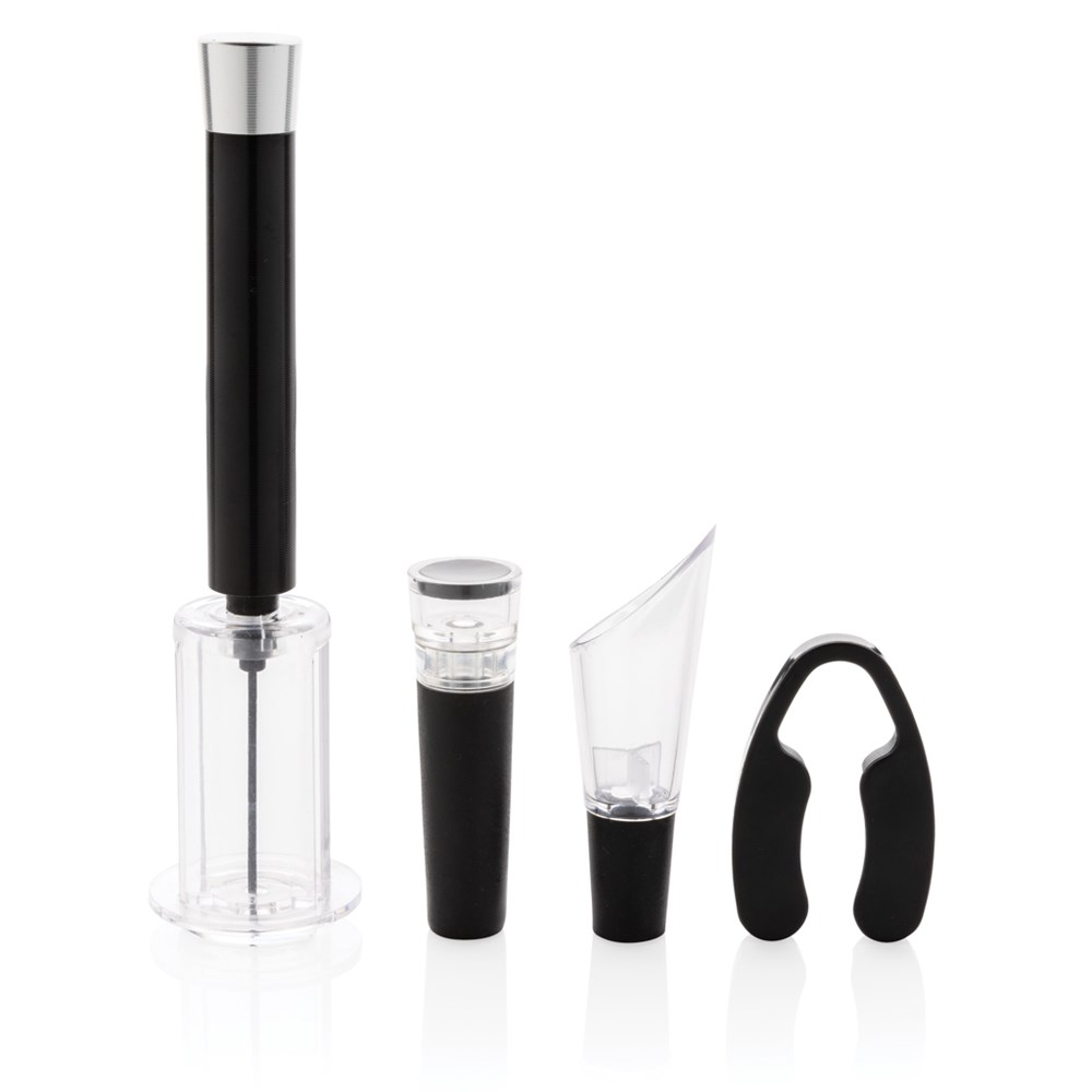 Alles wat je nodig hebt om je favoriete wijnen te openen, serveren en bewaren met deze wijnset van 4 stuks. De set bestaat uit een luchtpomp wijnopener, foliesnijder, wijnstopper met vacuümpomp & wijnschenker met beluchter. Verpakt in een luxe geschenkverpakking.