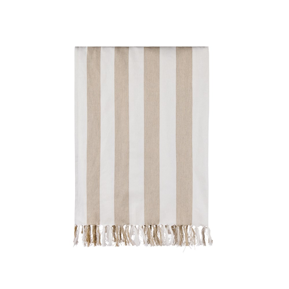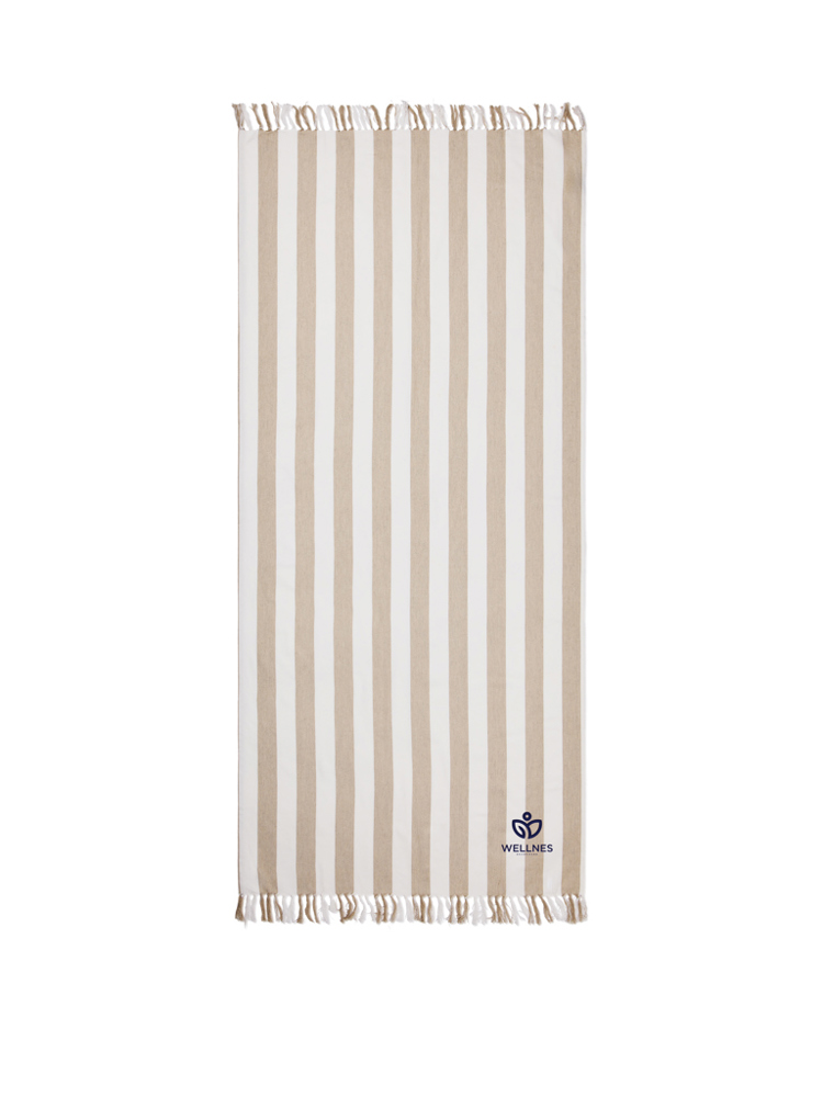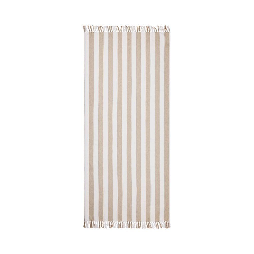 Dit hamamstrandlaken heeft een klassiek tweekleurig streeppatroon met franjes aan de korte zijden. Het is gemaakt van een lichte en luchtige 200 grams mix en combineert het comfort van katoen met de sneldrogende voordelen van polyester. Met een afmeting van 80x180 cm is het perfect voor op het strand of bij het zwembad. Gecertificeerd door GRS (Global Recycled Standard), GRS certificering garandeert dat de hele toeleveringsketen van de gerecyclede materialen gecertificeerd is. Het totale gerecyclede gehalte is gebaseerd op het totale productgewicht. Dit product bevat 68% GRS-gecertificeerd gerecycled katoen en 29% GRS-gecertificeerd gerecycled polyester.