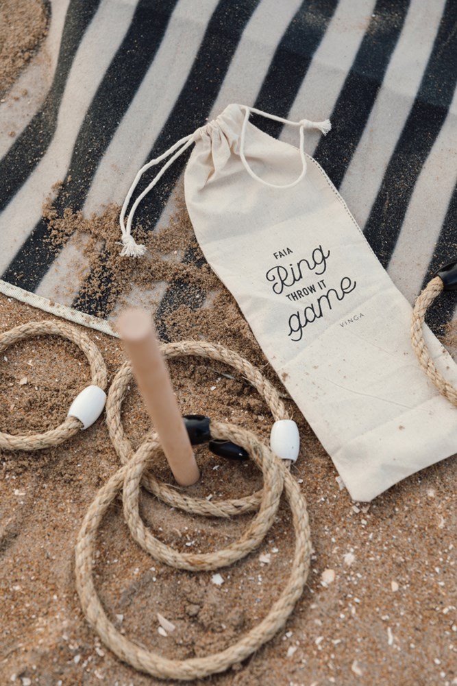 Een spel voor buiten dat net zo geschikt is voor op het strand als in het park, verpakt in een canvas tas met een achterkant van netstof waardoor het makkelijk mee te nemen is. Het spel bestaat uit touwen in de vorm van cirkels die je rond een stok gooit die je eenvoudig in de grond plaatst. De verschillende ringmaten leveren verschillende puntaantallen op. Een volledige handleiding met instructies is inbegrepen.