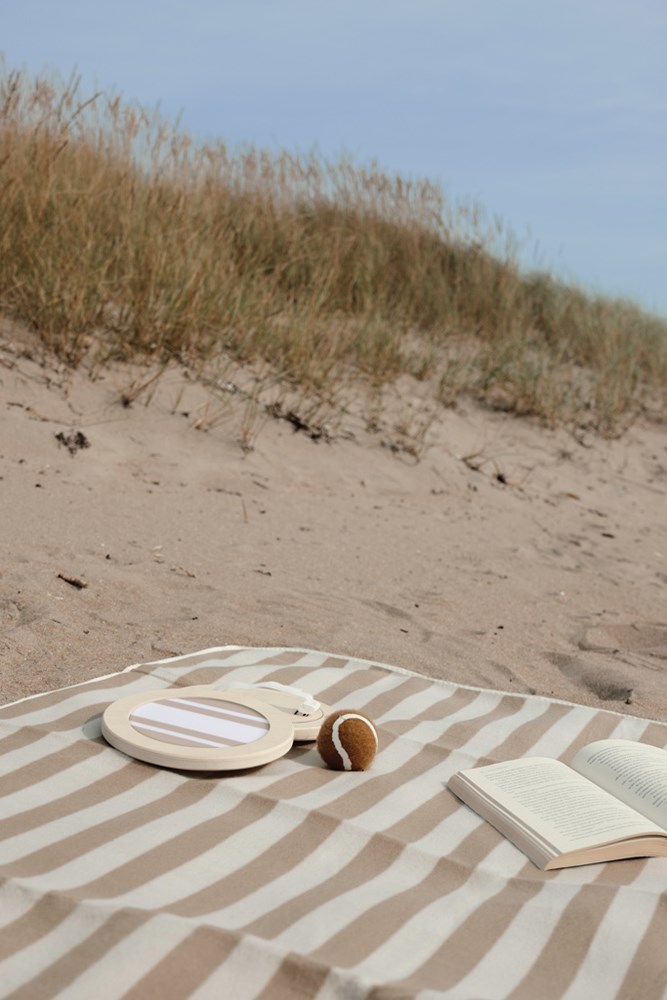 Dit is het ideale spel voor op het strand of in het park. Het bevat een bal en twee klittenbandvangers, gemaakt van FSC® gecertificeerd multiplex. Het ontwerp is sportief en toch verfijnd, met een tweekleurig gestreept patroon op de vangers en een bijpassende bruine bal. Het spel is handig verpakt in een canvas tas met een achterkant van gaas, zodat je het gemakkelijk mee kunt nemen. Inclusief instructiefolder.