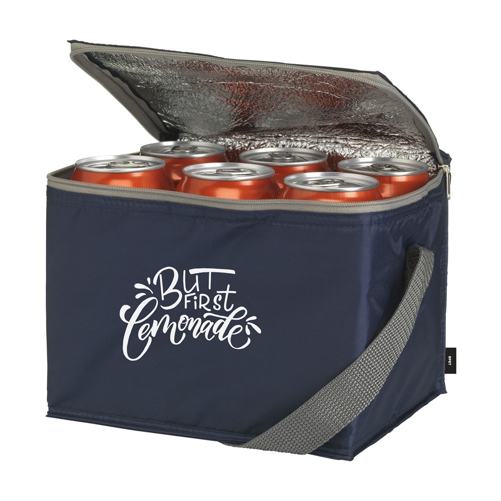 Koeltasje van 210D RPET polyester: gemaakt van gerecyclede PET-flessen. Geschikt voor 6 blikjes drank. Met draagriem. GRS-gecertificeerd. Inhoud ca. 3,5 liter.