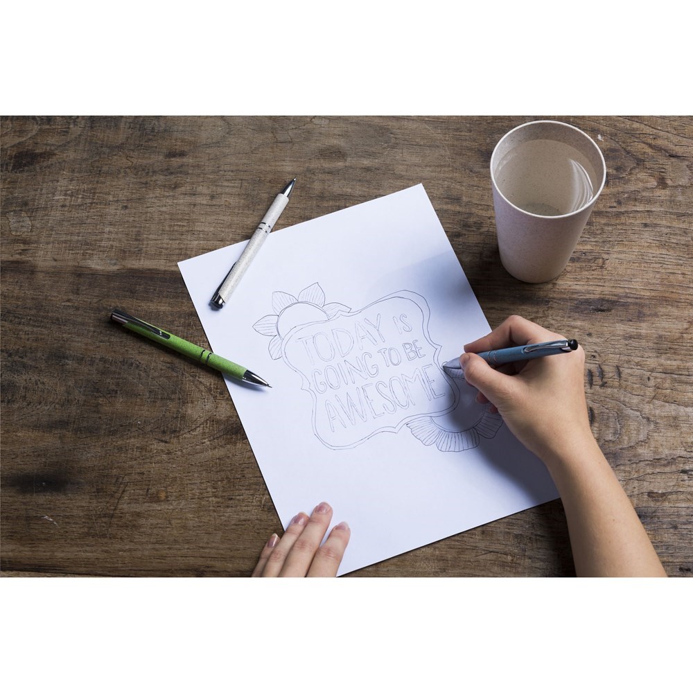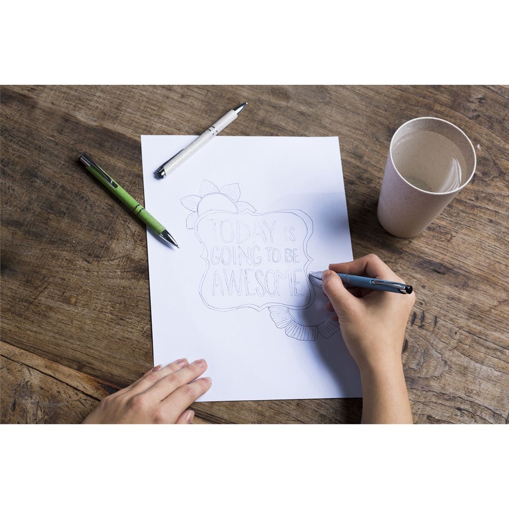 Blauwschrijvende balpen met houder van 50% ABS en 50% tarwestro, metalen clip en kunststof chrome accenten.