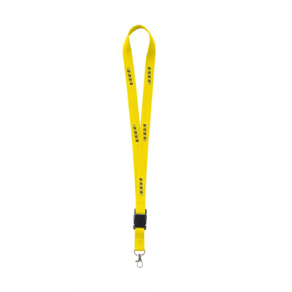 Lanyard van sterk geweven polyester met metalen karabijnhaak. Het onderste gedeelte is los te koppelen d.m.v. een kunststof kliksysteem.