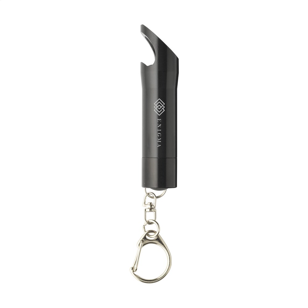 Aluminium staaflampje met 3 felwitte, energiezuinige LED-lampjes en flesopener. Aan karabijnhaak. Incl. celbatterijen. Per stuk in kraft doos.