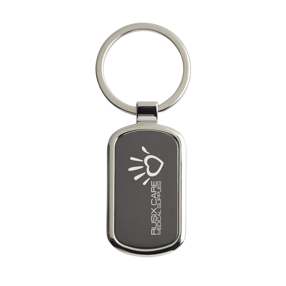 Rechthoekige, hoogglans, nikkelen sleutelhanger met zwart metalen inlay en stevige sleutelring....meer