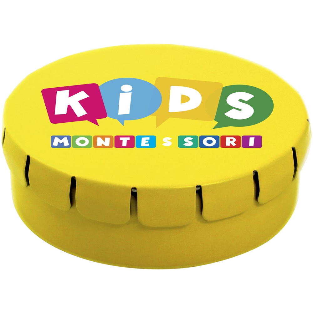 Natuurlijke pepermuntjes in blik met gemakkelijke drukopening. Kan worden besteld in een breed scala van kleuren en gevuld met verschillende vullingen: pepermunt, extra sterke pepermunt, suikervrije pepermunt, fruitsmaak, hartvormige aardbeiensnoepjes, kaneel-, citroen- en pepermuntsmaak, of chocolade. Kan worden gedecoreerd met een full colour digitale print op het deksel. Nettogewicht: 12 gram.