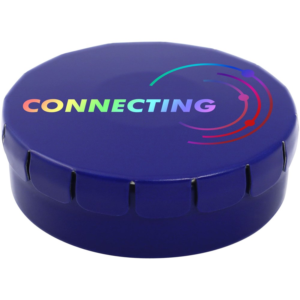 Natuurlijke pepermuntjes in blik met gemakkelijke drukopening. Kan worden besteld in een breed scala van kleuren en gevuld met verschillende vullingen: pepermunt, extra sterke pepermunt, suikervrije pepermunt, fruitsmaak, hartvormige aardbeiensnoepjes, kaneel-, citroen- en pepermuntsmaak, of chocolade. Kan worden gedecoreerd met een full colour digitale print op het deksel. Nettogewicht: 12 gram.