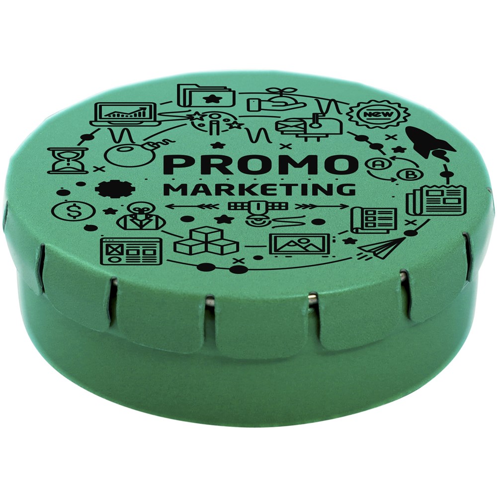 Natuurlijke pepermuntjes in blik met gemakkelijke drukopening. Kan worden besteld in een breed scala van kleuren en gevuld met verschillende vullingen: pepermunt, extra sterke pepermunt, suikervrije pepermunt, fruitsmaak, hartvormige aardbeiensnoepjes, kaneel-, citroen- en pepermuntsmaak, of chocolade. Kan worden gedecoreerd met een full colour digitale print op het deksel. Nettogewicht: 12 gram.