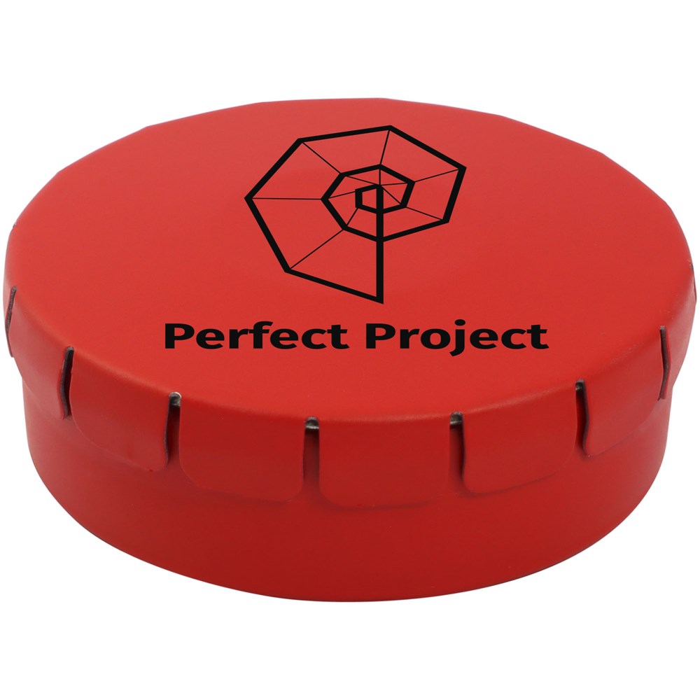 Natuurlijke pepermuntjes in blik met gemakkelijke drukopening. Kan worden besteld in een breed scala van kleuren en gevuld met verschillende vullingen: pepermunt, extra sterke pepermunt, suikervrije pepermunt, fruitsmaak, hartvormige aardbeiensnoepjes, kaneel-, citroen- en pepermuntsmaak, of chocolade. Kan worden gedecoreerd met een full colour digitale print op het deksel. Nettogewicht: 12 gram.