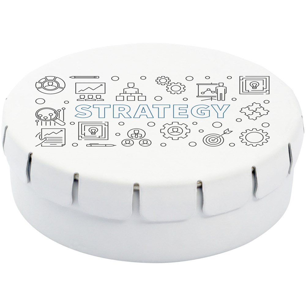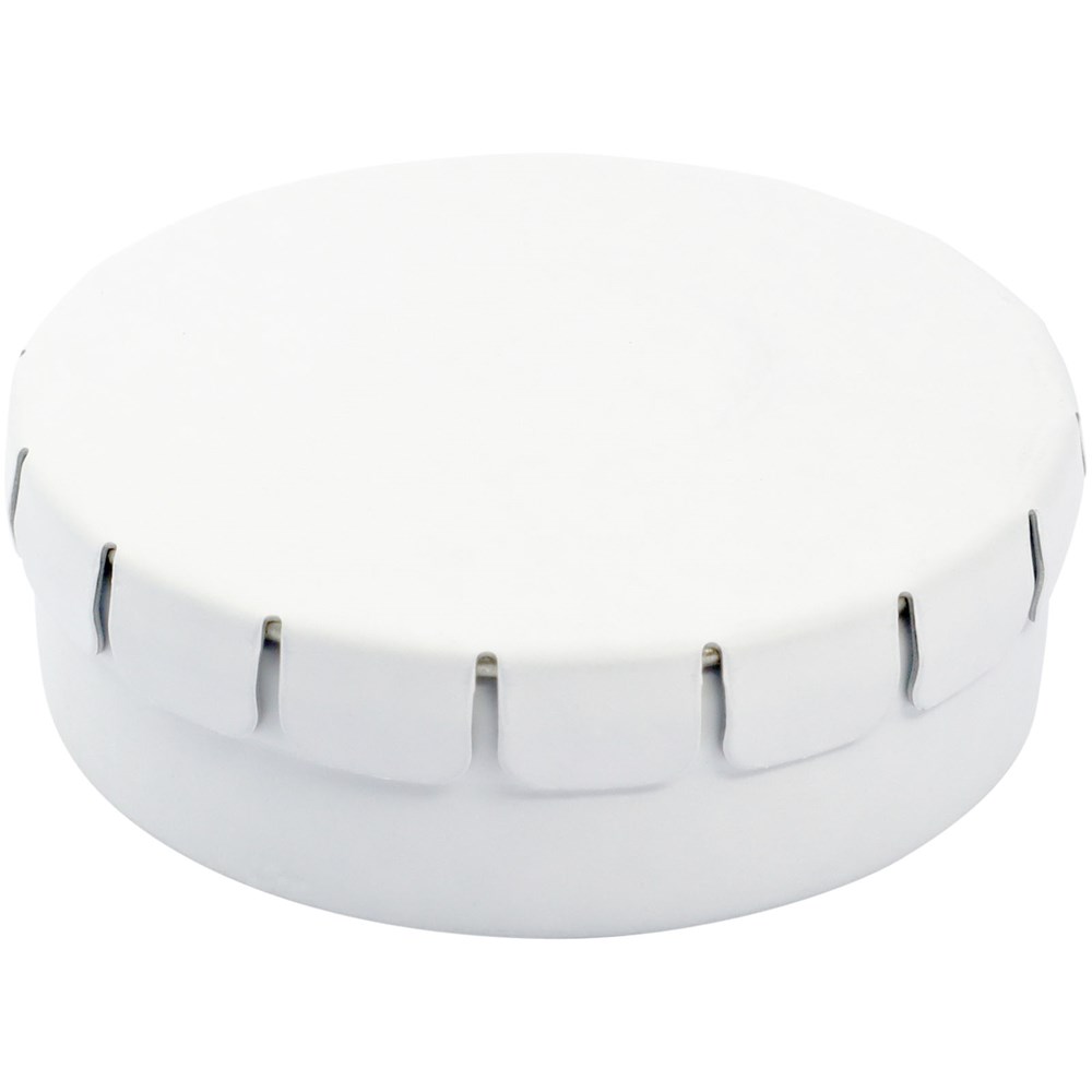 Natuurlijke pepermuntjes in blik met gemakkelijke drukopening. Kan worden besteld in een breed scala van kleuren en gevuld met verschillende vullingen: pepermunt, extra sterke pepermunt, suikervrije pepermunt, fruitsmaak, hartvormige aardbeiensnoepjes, kaneel-, citroen- en pepermuntsmaak, of chocolade. Kan worden gedecoreerd met een full colour digitale print op het deksel. Nettogewicht: 12 gram.