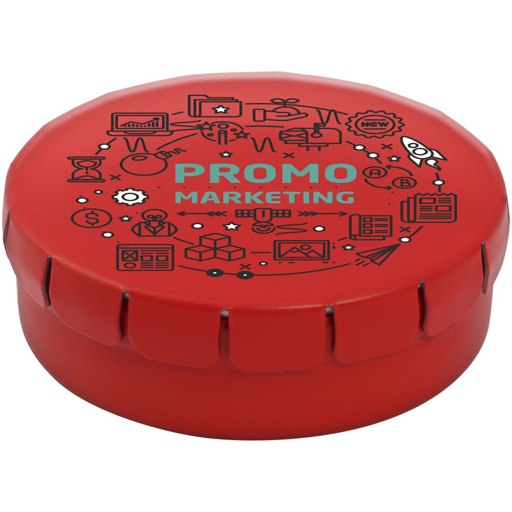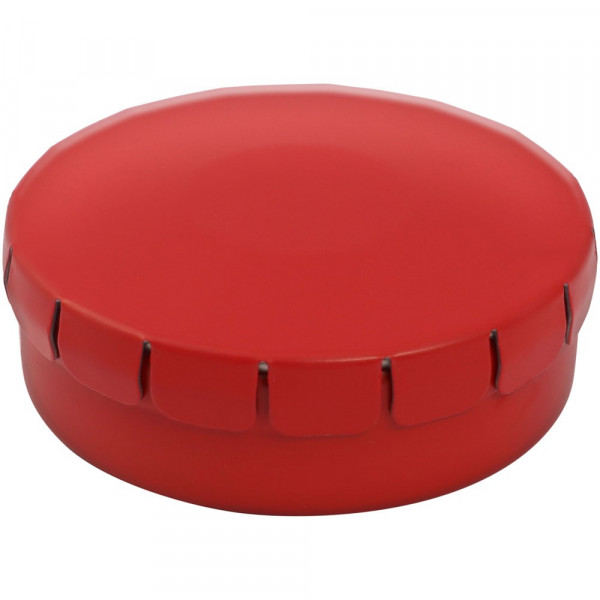 Suikervrije pepermunt in blik met gemakkelijke drukopening. Kan worden besteld in een breed scala van kleuren en gevuld met verschillende vullingen: pepermunt, extra sterke pepermunt, suikervrije pepermunt, fruitsmaak, hartvormige aardbeiensnoepjes, kaneel-, citroen- en pepermuntsmaak of chocolade. Kan worden gedecoreerd met een full colour digitale print op het deksel.