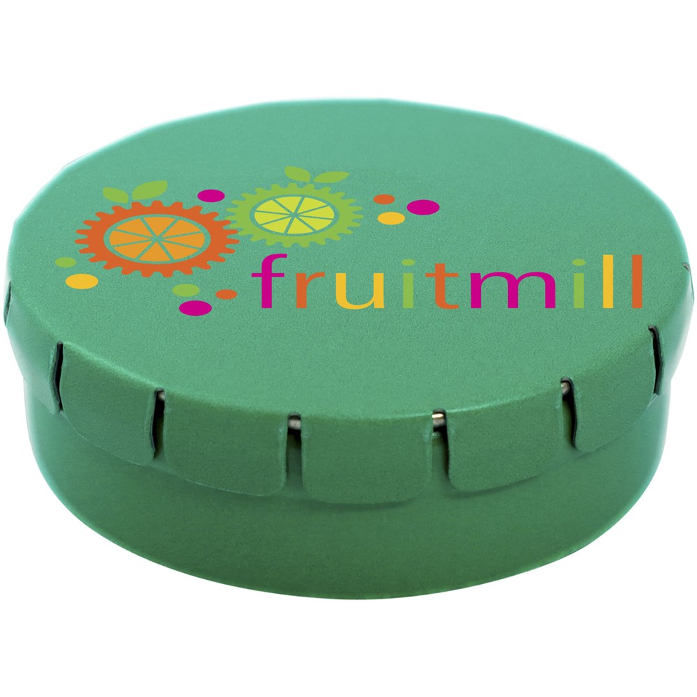 Suikervrije pepermunt in blik met gemakkelijke drukopening. Kan worden besteld in een breed scala van kleuren en gevuld met verschillende vullingen: pepermunt, extra sterke pepermunt, suikervrije pepermunt, fruitsmaak, hartvormige aardbeiensnoepjes, kaneel-, citroen- en pepermuntsmaak of chocolade. Kan worden gedecoreerd met een full colour digitale print op het deksel.