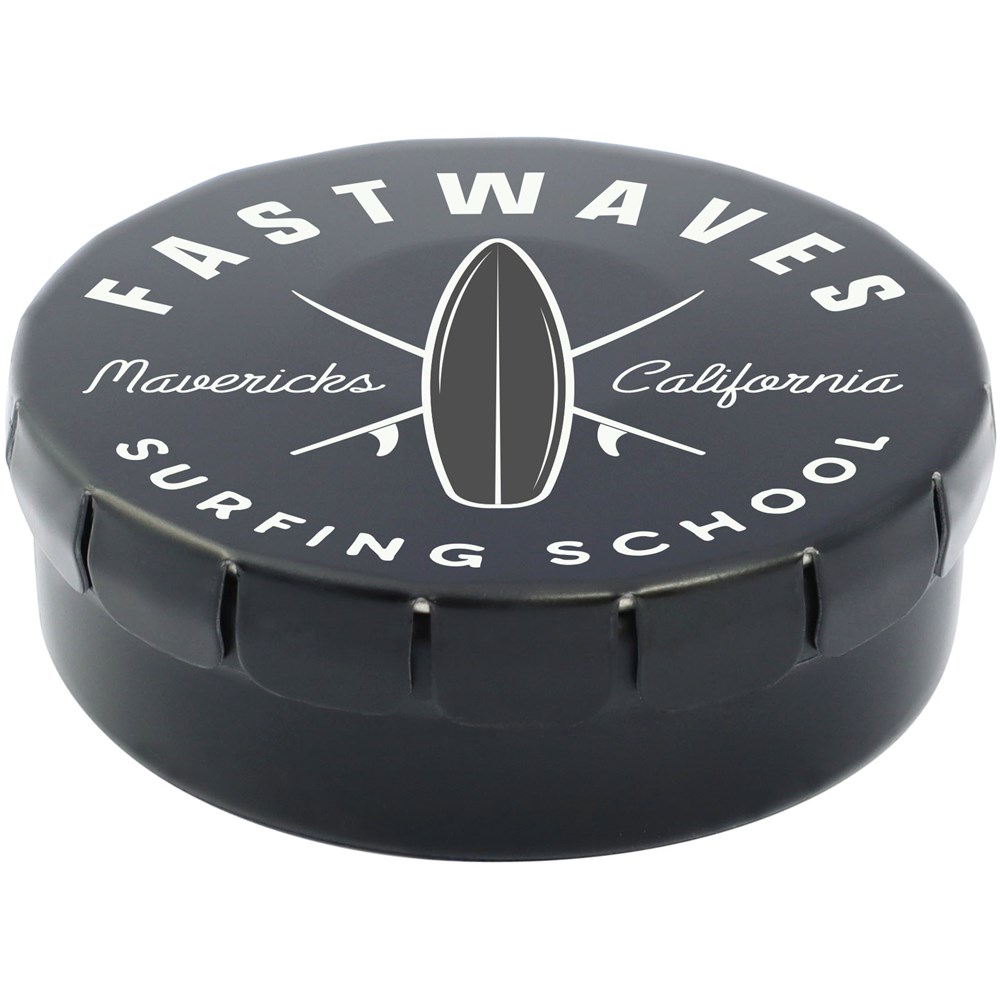 Suikervrije pepermunt in blik met gemakkelijke drukopening. Kan worden besteld in een breed scala van kleuren en gevuld met verschillende vullingen: pepermunt, extra sterke pepermunt, suikervrije pepermunt, fruitsmaak, hartvormige aardbeiensnoepjes, kaneel-, citroen- en pepermuntsmaak of chocolade. Kan worden gedecoreerd met een full colour digitale print op het deksel.