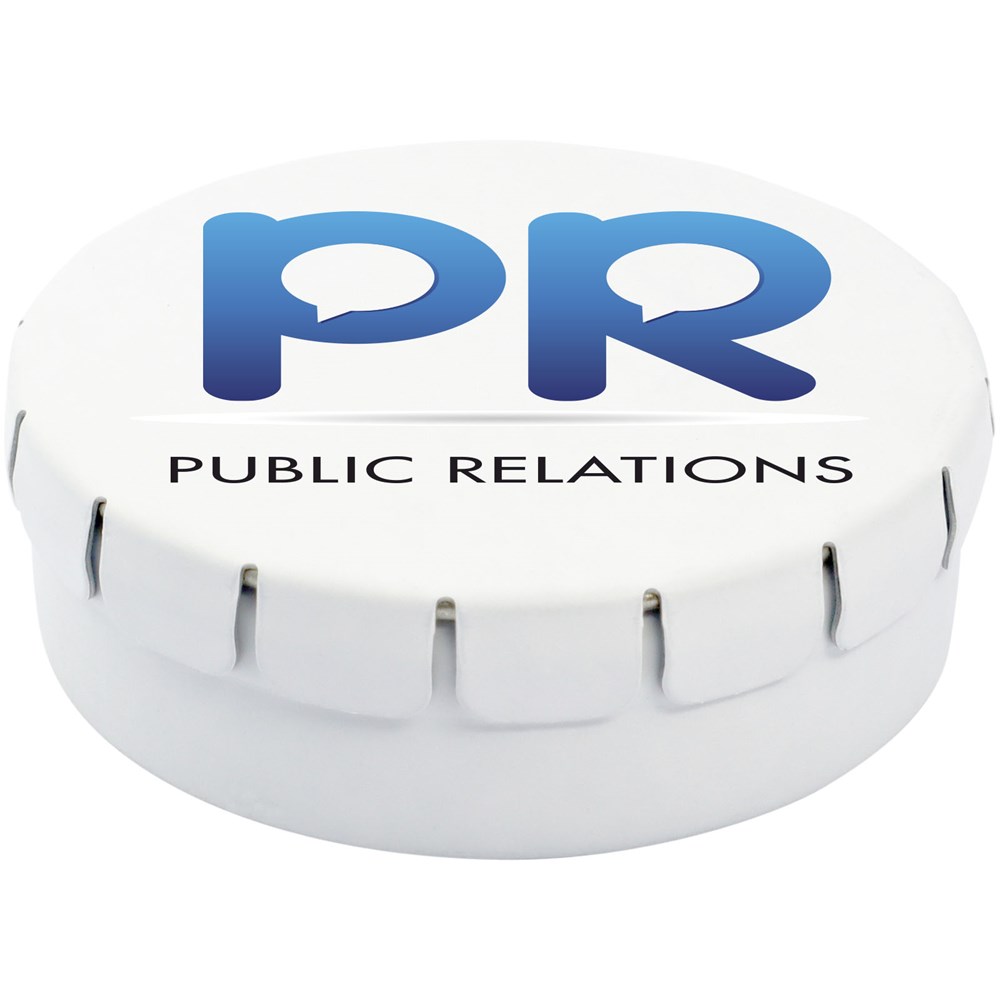 Suikervrije pepermunt in blik met gemakkelijke drukopening. Kan worden besteld in een breed scala van kleuren en gevuld met verschillende vullingen: pepermunt, extra sterke pepermunt, suikervrije pepermunt, fruitsmaak, hartvormige aardbeiensnoepjes, kaneel-, citroen- en pepermuntsmaak of chocolade. Kan worden gedecoreerd met een full colour digitale print op het deksel.