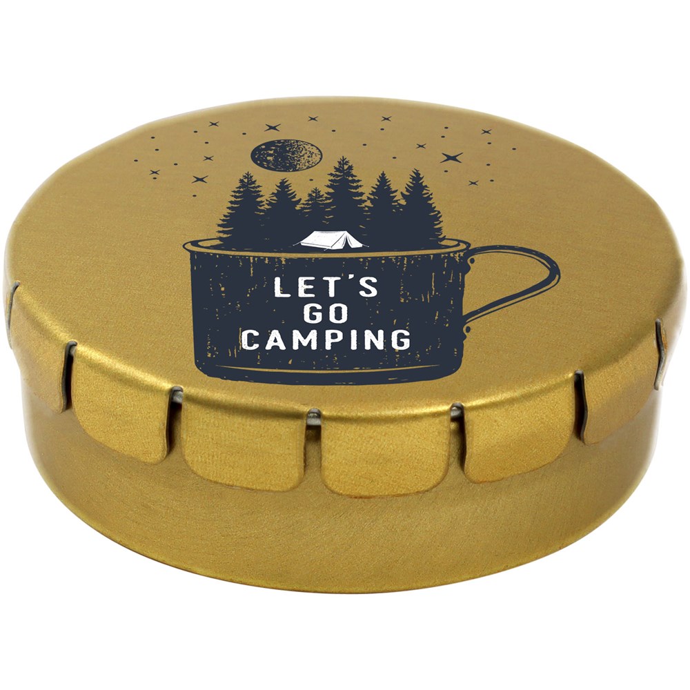 Snoepjes met fruitsmaak in blik met gemakkelijke drukopening. Kan worden besteld in een breed scala van kleuren en gevuld met verschillende vullingen: pepermunt, extra sterke pepermunt, suikervrije pepermunt, fruitsmaak, hartvormige aardbeiensnoepjes, kaneel-, citroen- en pepermuntsmaak, of chocolade. Kan worden gedecoreerd met een full colour digitale print op het deksel. Nettogewicht: 12 gram.