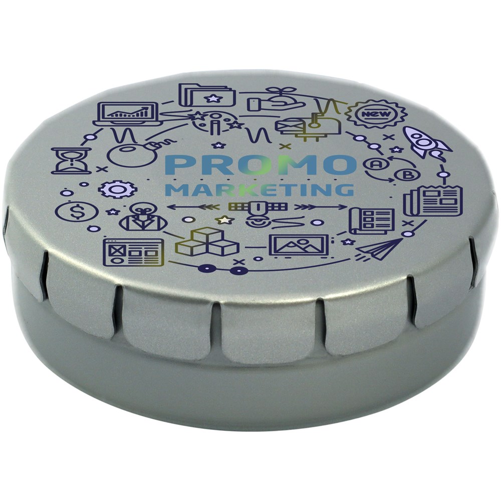 Snoepjes met fruitsmaak in blik met gemakkelijke drukopening. Kan worden besteld in een breed scala van kleuren en gevuld met verschillende vullingen: pepermunt, extra sterke pepermunt, suikervrije pepermunt, fruitsmaak, hartvormige aardbeiensnoepjes, kaneel-, citroen- en pepermuntsmaak, of chocolade. Kan worden gedecoreerd met een full colour digitale print op het deksel. Nettogewicht: 12 gram.