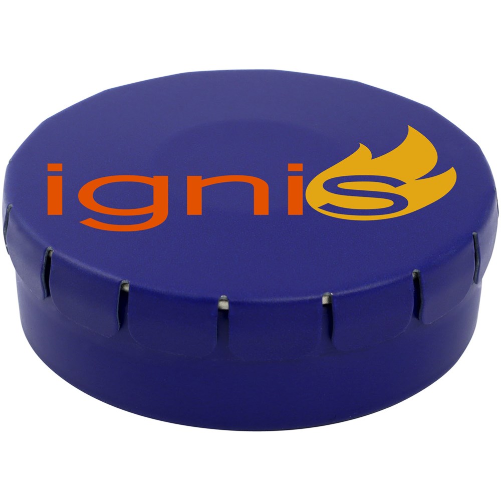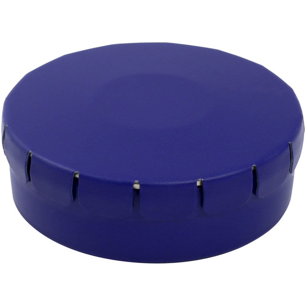 Snoepjes met fruitsmaak in blik met gemakkelijke drukopening. Kan worden besteld in een breed scala van kleuren en gevuld met verschillende vullingen: pepermunt, extra sterke pepermunt, suikervrije pepermunt, fruitsmaak, hartvormige aardbeiensnoepjes, kaneel-, citroen- en pepermuntsmaak, of chocolade. Kan worden gedecoreerd met een full colour digitale print op het deksel. Nettogewicht: 12 gram.