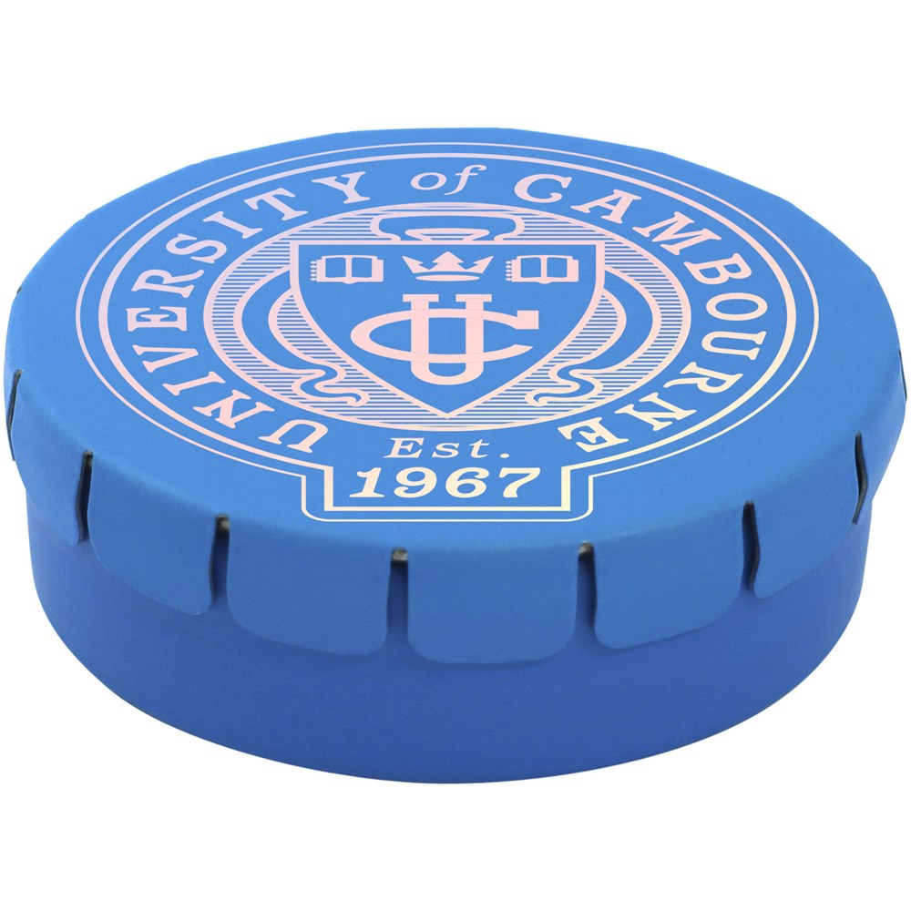 Snoepjes met fruitsmaak in blik met gemakkelijke drukopening. Kan worden besteld in een breed scala van kleuren en gevuld met verschillende vullingen: pepermunt, extra sterke pepermunt, suikervrije pepermunt, fruitsmaak, hartvormige aardbeiensnoepjes, kaneel-, citroen- en pepermuntsmaak, of chocolade. Kan worden gedecoreerd met een full colour digitale print op het deksel. Nettogewicht: 12 gram.