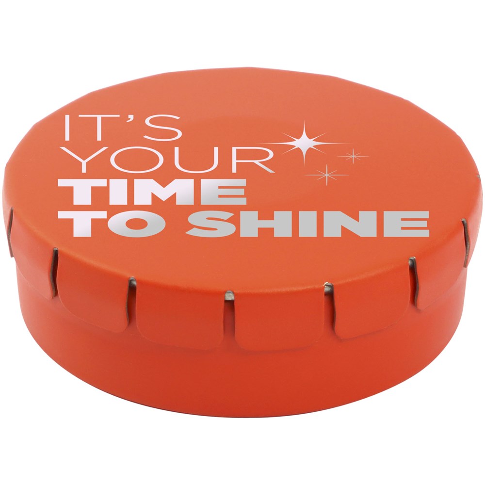 Snoepjes met fruitsmaak in blik met gemakkelijke drukopening. Kan worden besteld in een breed scala van kleuren en gevuld met verschillende vullingen: pepermunt, extra sterke pepermunt, suikervrije pepermunt, fruitsmaak, hartvormige aardbeiensnoepjes, kaneel-, citroen- en pepermuntsmaak, of chocolade. Kan worden gedecoreerd met een full colour digitale print op het deksel. Nettogewicht: 12 gram.