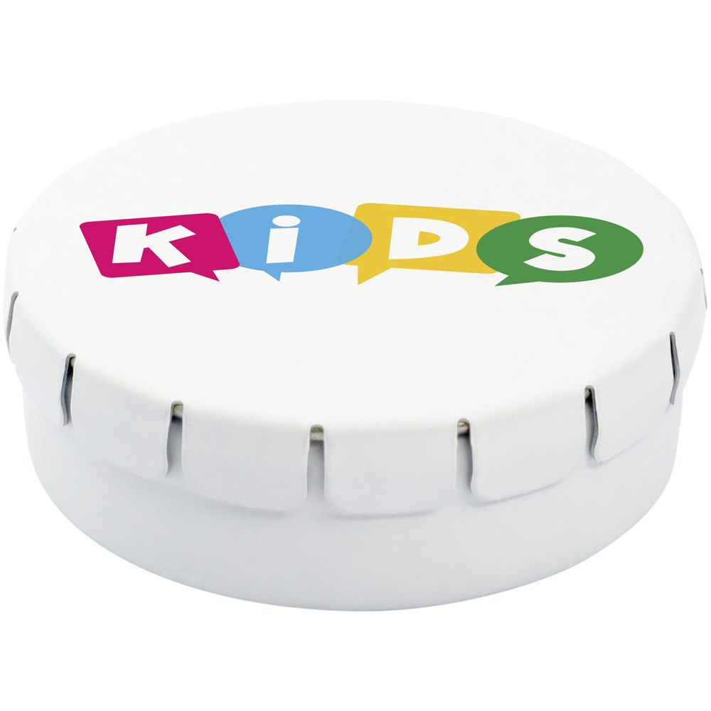 Snoepjes met fruitsmaak in blik met gemakkelijke drukopening. Kan worden besteld in een breed scala van kleuren en gevuld met verschillende vullingen: pepermunt, extra sterke pepermunt, suikervrije pepermunt, fruitsmaak, hartvormige aardbeiensnoepjes, kaneel-, citroen- en pepermuntsmaak, of chocolade. Kan worden gedecoreerd met een full colour digitale print op het deksel. Nettogewicht: 12 gram.
