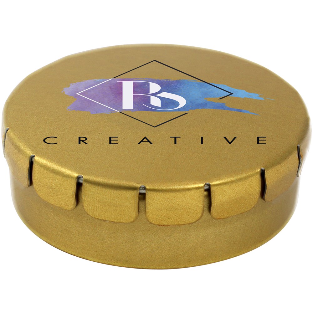 Snoepjes met kaneelsmaak in blik met gemakkelijke drukopening. Kan worden besteld in een breed scala van kleuren en gevuld met verschillende vullingen: pepermunt, extra sterke pepermunt suikervrije pepermunt, fruitsmaak, hartvormige aardbeiensnoepjes, kaneel-, citroen- en pepermuntsmaak, of chocolade. Kan worden gedecoreerd met een full colour digitale print op het deksel.