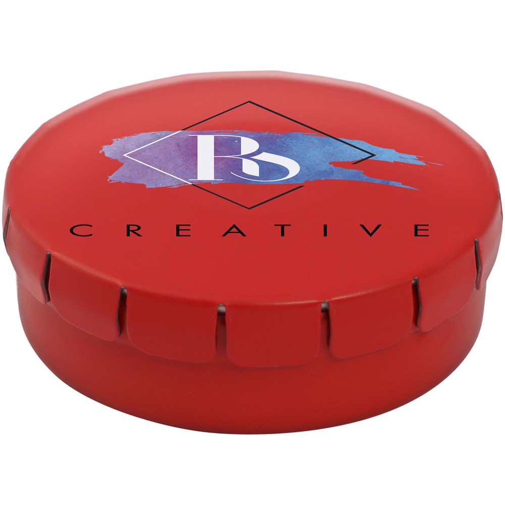 Snoepjes met kaneelsmaak in blik met gemakkelijke drukopening. Kan worden besteld in een breed scala van kleuren en gevuld met verschillende vullingen: pepermunt, extra sterke pepermunt suikervrije pepermunt, fruitsmaak, hartvormige aardbeiensnoepjes, kaneel-, citroen- en pepermuntsmaak, of chocolade. Kan worden gedecoreerd met een full colour digitale print op het deksel.