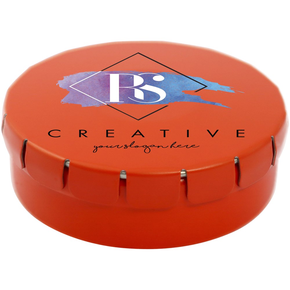 Snoepjes met kaneelsmaak in blik met gemakkelijke drukopening. Kan worden besteld in een breed scala van kleuren en gevuld met verschillende vullingen: pepermunt, extra sterke pepermunt suikervrije pepermunt, fruitsmaak, hartvormige aardbeiensnoepjes, kaneel-, citroen- en pepermuntsmaak, of chocolade. Kan worden gedecoreerd met een full colour digitale print op het deksel.