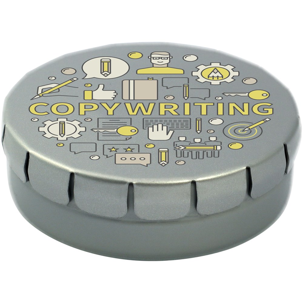Snoepjes met kaneelsmaak in blik met gemakkelijke drukopening. Kan worden besteld in een breed scala van kleuren en gevuld met verschillende vullingen: pepermunt, extra sterke pepermunt suikervrije pepermunt, fruitsmaak, hartvormige aardbeiensnoepjes, kaneel-, citroen- en pepermuntsmaak, of chocolade. Kan worden gedecoreerd met een full colour digitale print op het deksel.