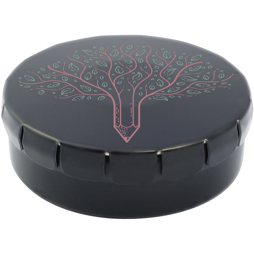 Snoepjes met kaneelsmaak in blik met gemakkelijke drukopening. Kan worden besteld in een breed scala van kleuren en gevuld met verschillende vullingen: pepermunt, extra sterke pepermunt suikervrije pepermunt, fruitsmaak, hartvormige aardbeiensnoepjes, kaneel-, citroen- en pepermuntsmaak, of chocolade. Kan worden gedecoreerd met een full colour digitale print op het deksel.