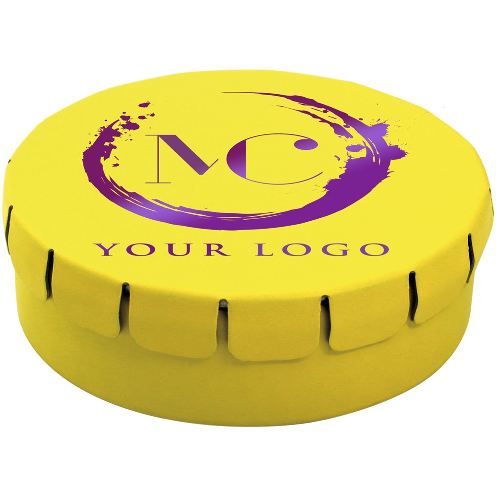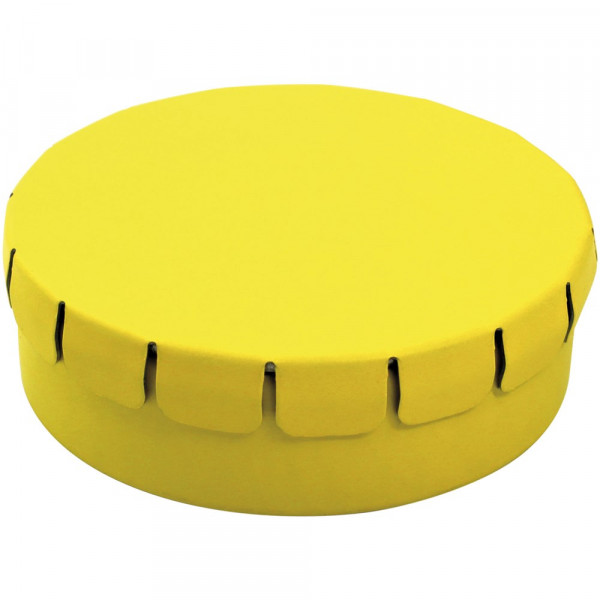 Snoepjes met kaneelsmaak in blik met gemakkelijke drukopening. Kan worden besteld in een breed scala van kleuren en gevuld met verschillende vullingen: pepermunt, extra sterke pepermunt suikervrije pepermunt, fruitsmaak, hartvormige aardbeiensnoepjes, kaneel-, citroen- en pepermuntsmaak, of chocolade. Kan worden gedecoreerd met een full colour digitale print op het deksel.
