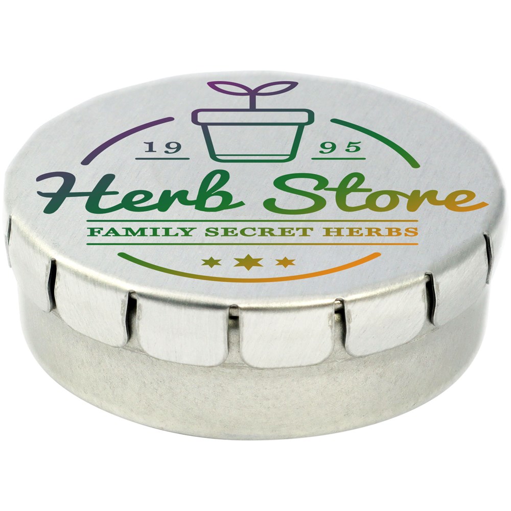 Snoepjes met citroen- en pepermuntsmaak in blik met gemakkelijke drukopening. Kan worden besteld in een breed scala van kleuren en gevuld met verschillende vullingen: pepermunt, extra sterke pepermunt, suikervrije pepermunt, fruitsmaak, hartvormige aardbeiensnoepjes, kaneel-, citroen- en pepermuntsmaak, of chocolade. Kan worden gedecoreerd met een full colour digitale print op het deksel.