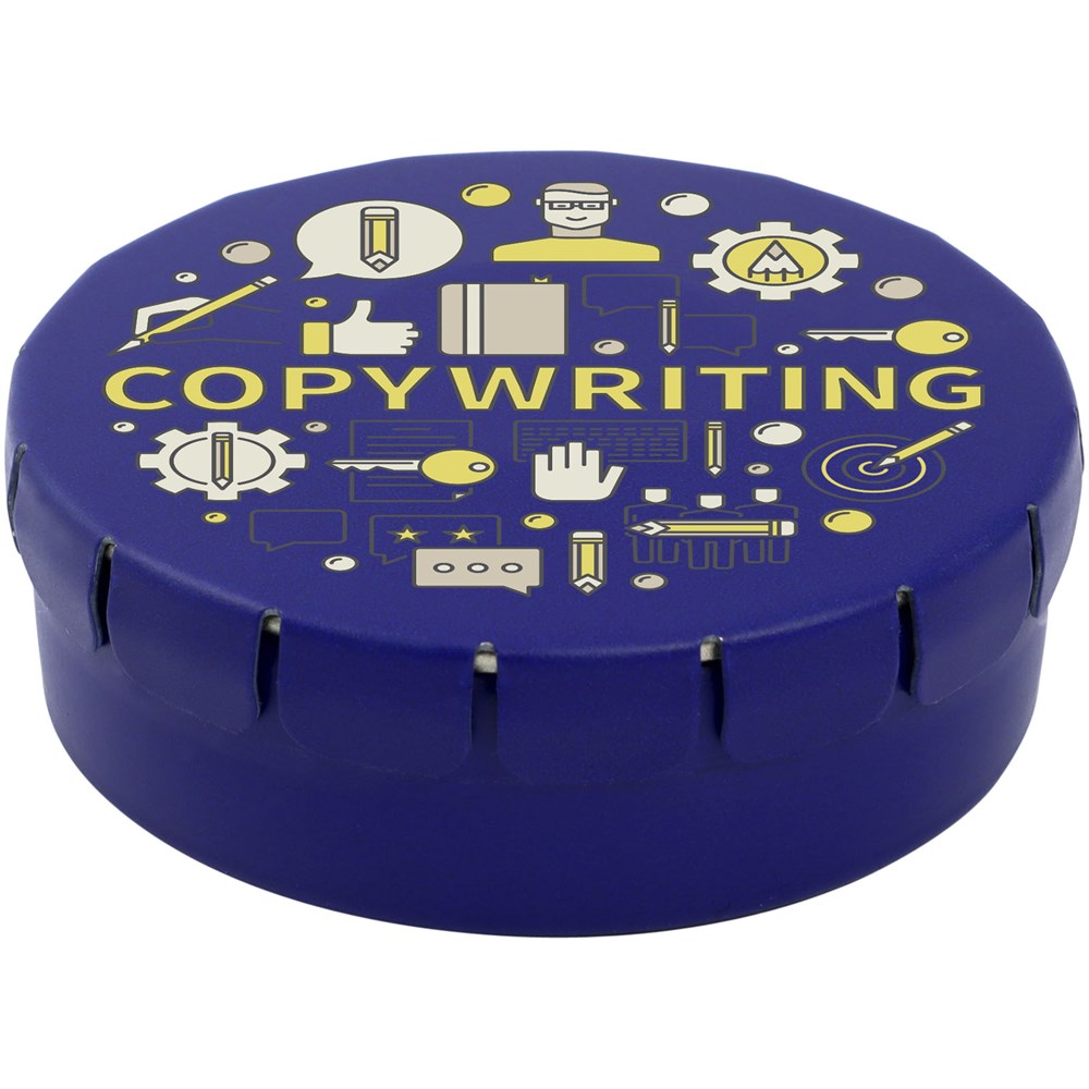 Snoepjes met citroen- en pepermuntsmaak in blik met gemakkelijke drukopening. Kan worden besteld in een breed scala van kleuren en gevuld met verschillende vullingen: pepermunt, extra sterke pepermunt, suikervrije pepermunt, fruitsmaak, hartvormige aardbeiensnoepjes, kaneel-, citroen- en pepermuntsmaak, of chocolade. Kan worden gedecoreerd met een full colour digitale print op het deksel.