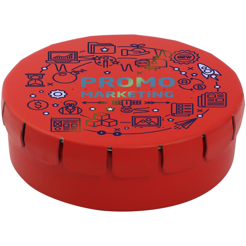 Snoepjes met citroen- en pepermuntsmaak in blik met gemakkelijke drukopening. Kan worden besteld in een breed scala van kleuren en gevuld met verschillende vullingen: pepermunt, extra sterke pepermunt, suikervrije pepermunt, fruitsmaak, hartvormige aardbeiensnoepjes, kaneel-, citroen- en pepermuntsmaak, of chocolade. Kan worden gedecoreerd met een full colour digitale print op het deksel.