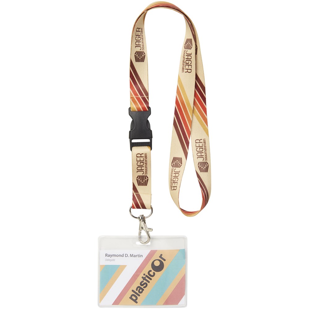 Bucks full colour sublimatie lanyard. Bedrukking is beschikbaar aan één of beide zijden. Voor dubbelzijdige bedrukking kun je kiezen uit de standaard of fitted optie (fitted betekent dat de bedrukking aan beide zijden gelijk is). Lanyard heeft een metalen haak en plastic gesp. Geschikt voor een naambadge, ID-kaart of sleutels. Verkrijgbaar in 4 verschillende breedtes: 10, 15, 20 en 25 mm.