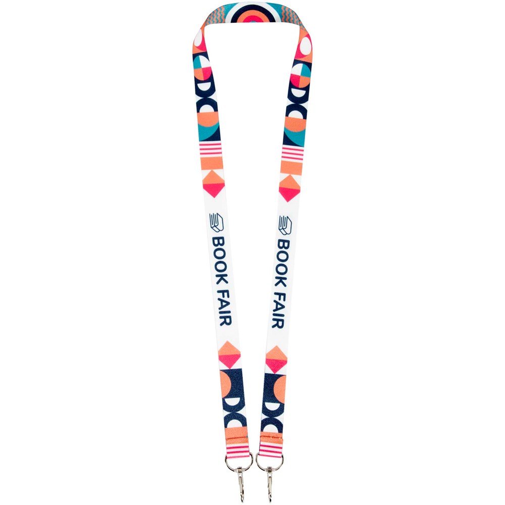 Sublimatielanyard van RPET met full colour ontwerp, RPET-tape en 2 metalen haken. Kan een naambadge, ID-kaart of sleutels bevatten. Verkrijgbaar in 4 verschillende breedtes: 10, 15, 20 en 25 mm.