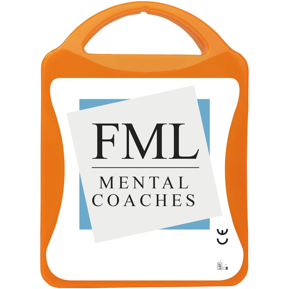 Deze Mykit is speciaal samengesteld voor fietsers. Of u nu de bergen in gaat of met het hele gezin op pad bent op vakantie. Met deze kit bent u voorbereid op eventuele kleine ongevallen tijdens het fietsen of een lekke band. Inhoud:12 Waterbestendige pleisters, 4 Vochtige reinigingsdoekjes, 2 Droge reinigingsdoekjes, 1 Fiets Repartiesetje. Alle eerste hulp en verzorgingsartikelen in de kit voldoen aan de EU regelgeving. Prijs is inclusief full colour bedrukking.