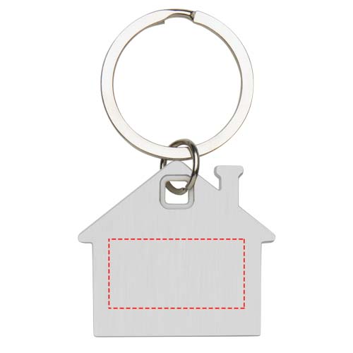 Sleutelhanger in de vorm van een huis, met een roestvrijstalen plaatje met een mat design aan de voor- en achterkant en een gekleurde plastic chip in het midden.