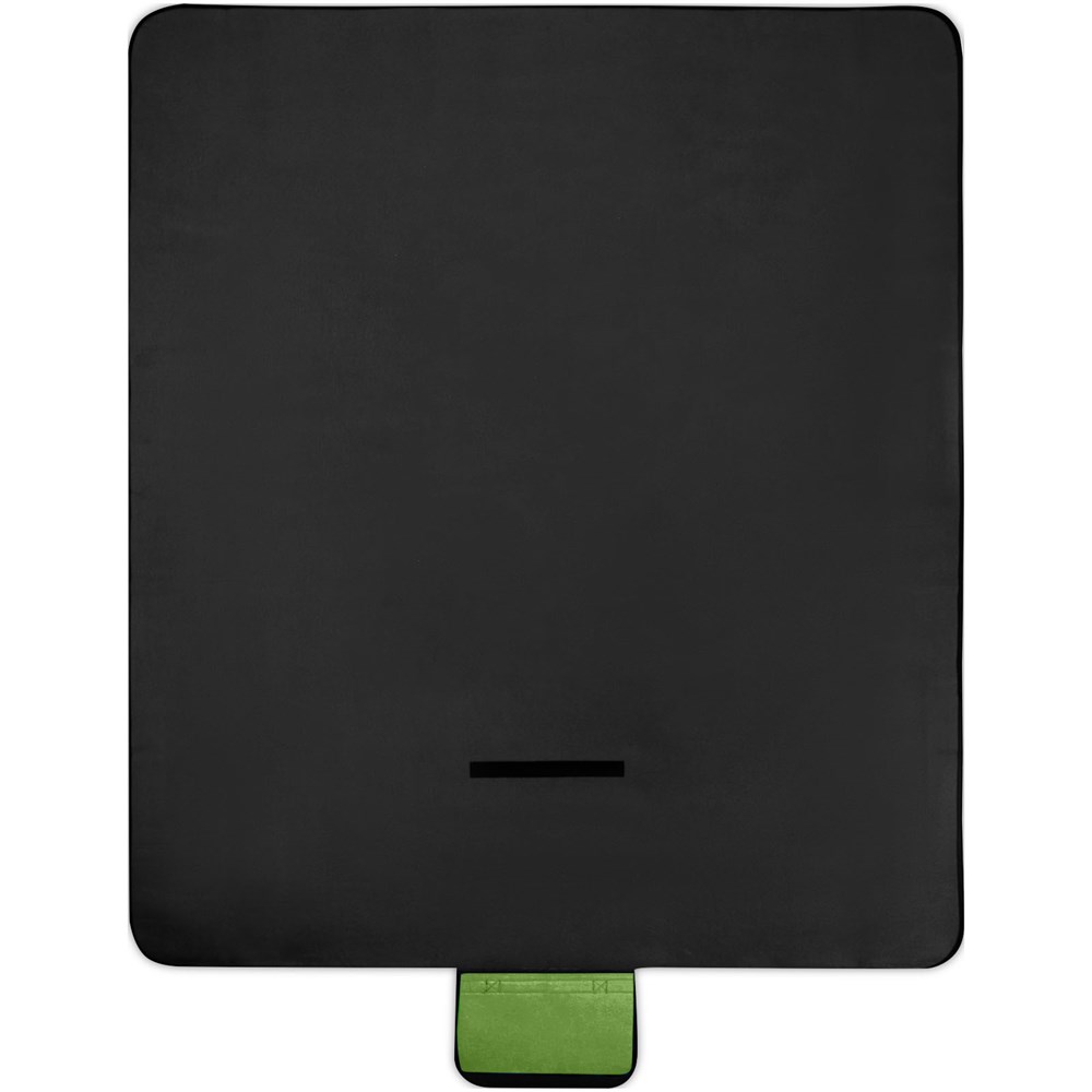 Waterbestendig picknickkleed van 140 g/m², gemaakt van GRS-gecertificeerd gerecycled PET-plastic. Eenmaal gevouwen en veilig vastgemaakt, is het kleed gemakkelijk op te bergen en mee te nemen met het bijgeleverde draaghandvat.