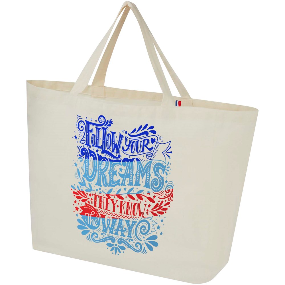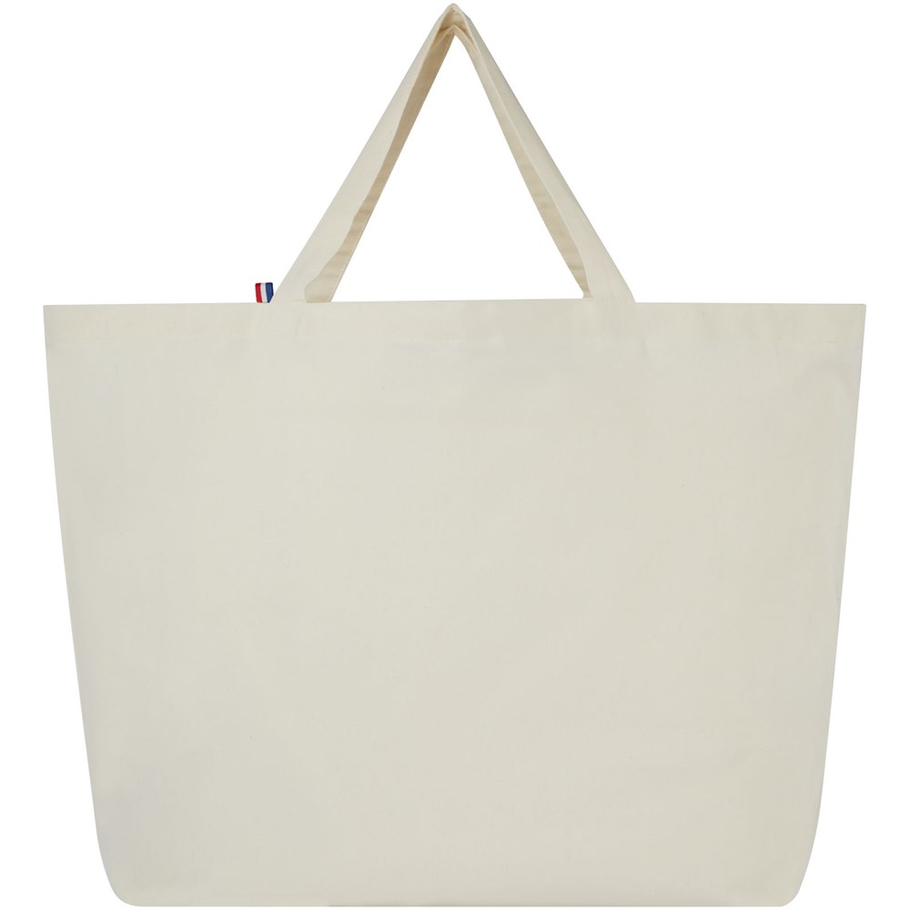 Deze draagtas met grote inhoud is gemaakt van de beste, 100% gerecyclede materialen. Hij is gemaakt voor dagelijks gebruik en geschikt om zware boeken of boodschappen in mee te nemen. De 200 g/m² gerecyclede katoen/polyester mix zorgt voor duurzaamheid en betrouwbaarheid, waardoor de tas een weerstand heeft tot 14kg gewicht. De garens komen uit Azië, maar het weven, spinnen en de productie gebeurt allemaal in Frankrijk.